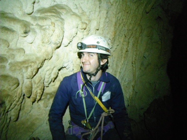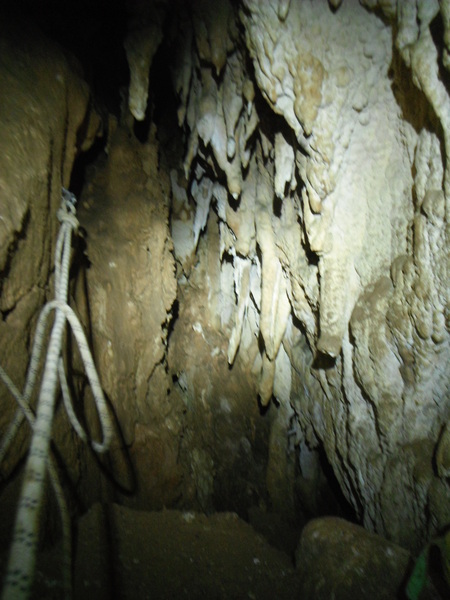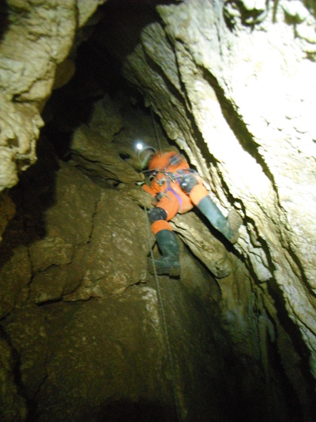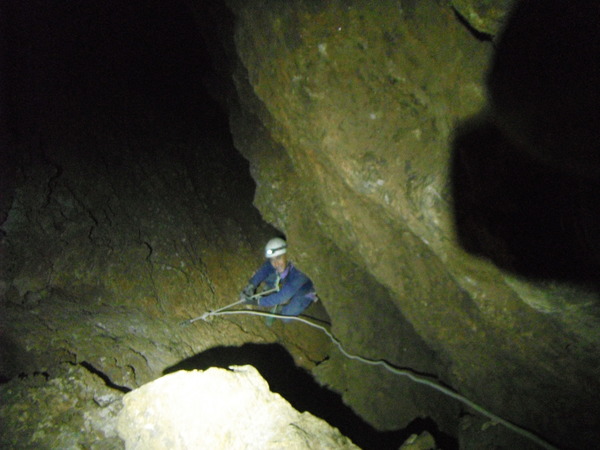 Visto che alla base del pozzo oramai c’e’ un bel gruppetto inizio a far risalire Claudio. Anche se ancora con qualche esitazione sui frazionamenti se la cava egregiamente. Lo lascio allongiato in sicurezza con la raccomandazione di non muoversi. Scendo e ingaggio Luana per la risalita. Mentre saliamo arrivano anche Adriano e Flavia. Nonno Giorgio rimane indietro a disarmare. Anche Luana passa indenne il frazionamento con uscita laterale dal pozzo. Mentre lei e’ impegnata strapazzo un po’ Claudio che mentre ero giu’ si e’ spostato alla base del pozzo successivo. Di per se’ quello che ha fatto Claudio e’ nulla di male, ma durante il corso si devono seguire alla lettera le indicazioni degli istruttori altrimenti le possibilita’ che qualcuno si faccia male aumentano in maniera esponenziale. Come dicevo quindi, lo tratto un po’ male cercando di fargli capire l’errore che ha fatto. Flavia inizia a risalire con Ivano e Adriano. Noi ci spostiamo alla base del pozzo successivo, quello con il frazionamento fetente. Claudio se la cava bene.