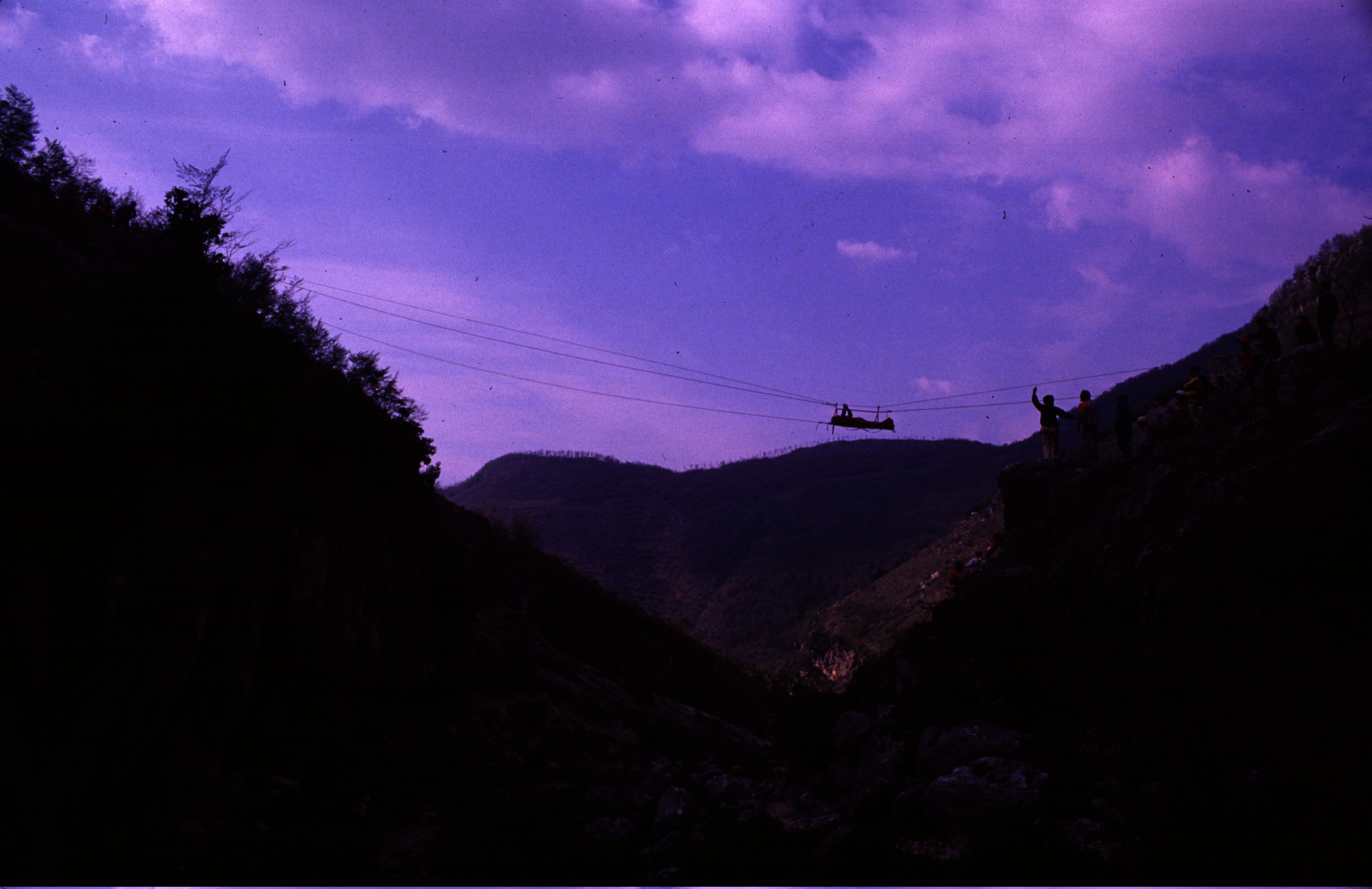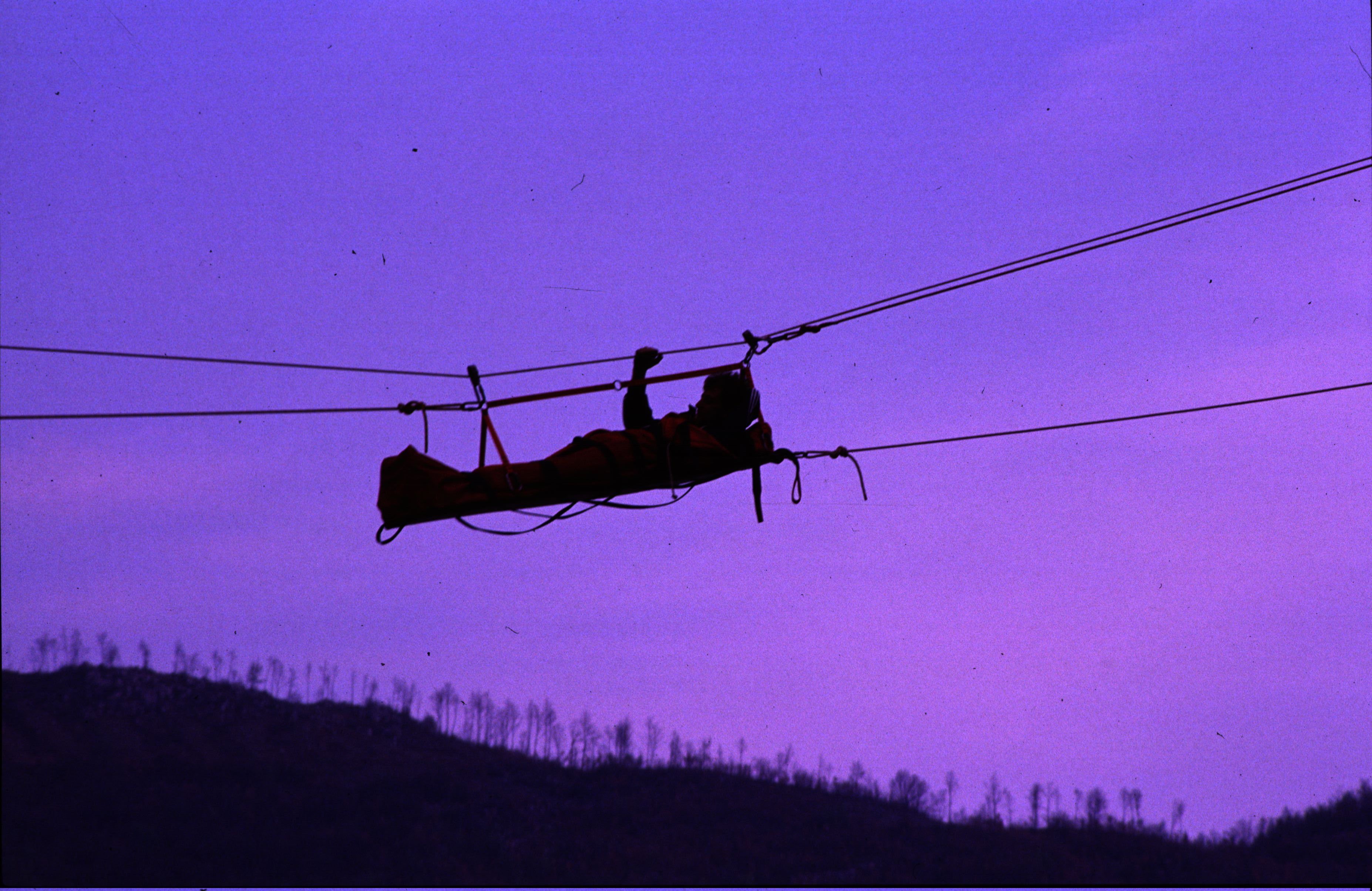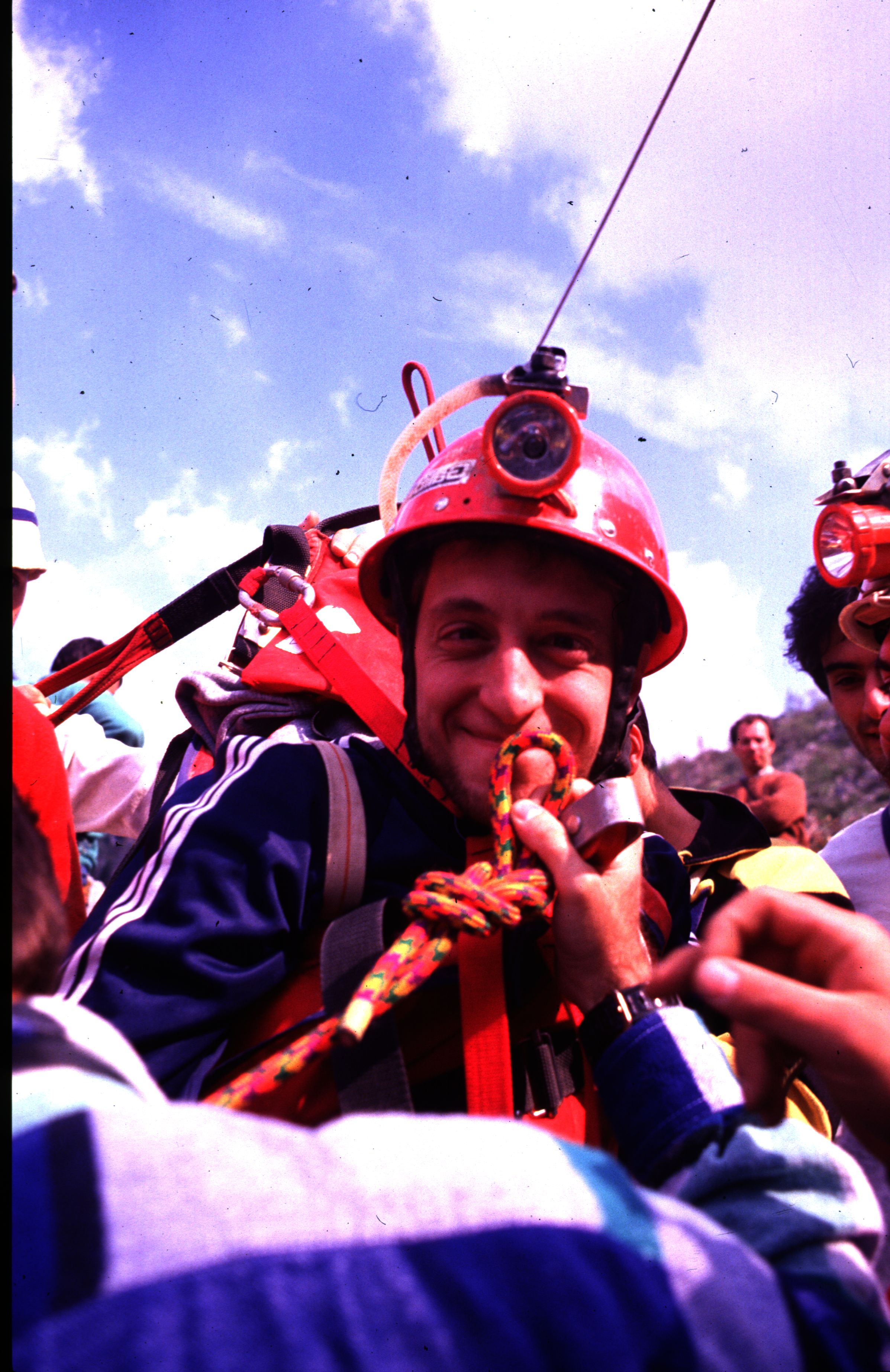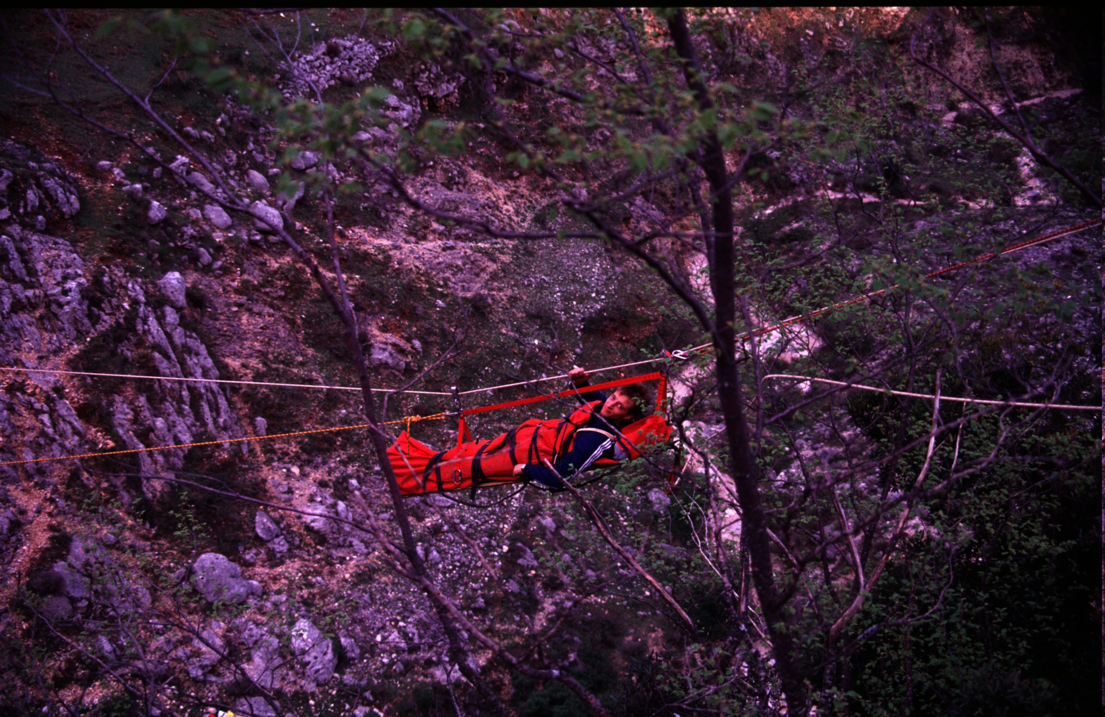 Cosa e’ successo, vi domanderete? Volevamo far passare la barella con finto ferito da una parete all’altra con una lunga teleferica. Ora, come tutti, abbiamo fiducia sconfinata nelle attrezzature, pero’…Decidemmo che il ferito doveva essere molto leggero. La scelta cadde quasi naturalmente sul Pantera. Con le buone e con le cattive fu convinto a farsi imbarellare. Eccolo qui pronto a sacrificarsi per la scienza!
