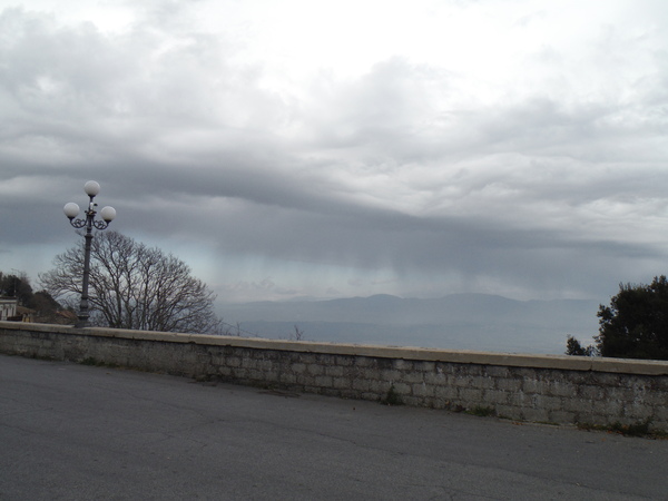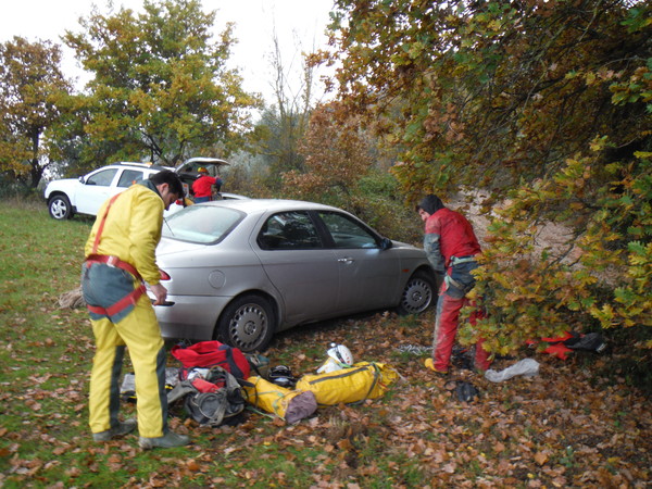 Di solito sono mattinieri quindi e’ piu’ probabile che siano andati direttamente al parcheggio vicino all’ingresso della grotta. Mi riprometto di andare a dare un’occhiata appena sbrigate le mie faccende. Tra le altre cose passo a ritirare il permesso di accesso al Soratte. Ritorno indietro pensando di mettere in pratica il mio proposito di passare al parcheggio di grotta Sbardy pero’ incontro Guido con alcuni suoi amici. Con Guido siamo stati assieme in settimana bianca ma e’ da un po’ che non ci vediamo. E’ insieme ad alcuni amici, non li conosco, ci presentiamo. Stanno andando a visitare i bunker. E’ un’ottima occasione per prendere un caffe’ assieme e fare 4 chiacchiere quindi ci dirigiamo nuovamente verso il bar. Ci sistemiamo al tavolino nel tendone che fa da veranda al bar ed iniziamo a parlare di sciate andate e future. Entra nel bar Fausto, mi alzo per salutarlo e fargli gli auguri poi mi soffermo qualche minuto a parlare con lui. In pratica pero’ abbandono Guido ed i suoi amici. Mi aspettano per un po’ ma poi si alzano per tornare al piazzale. Finisco di parlare con Fausto, lo saluto e li raggiungo scusandomi. Al piazzale trovo Giuseppe e Simone, li saluto e li presento. Guido ed i suoi amici partono per la gita ai bunker. Rimaniamo noi 3 a proseguire con i saluti e chiacchiere mentre aspettiamo Marika, Andrea e Giulio. Alle 10.30 compaiono sulla macchina di Andrea. Come prima cosa si torna al bar! O meglio, loro vanno tutti al bar, io mi dirigo con decisione alla pizzeria per ritirare la pizza che avevo ordinato appena arrivato. La consumo sul posto, quando i miei amici ritornano colazionati, ho finito anche io. Ora si che si ragiona. Ritornati al parcheggio spostiamo il materiale di Simone e Giuseppe nella mia macchina. Si puo’ salire al massimo con 2 macchine, quindi andremo con quella di Andrea e la mia. Arriviamo alla sbarra, Giuseppe scende a sollevarla ma non riesce ad aprire il lucchetto. Vado a vedere anche io. In effetti la chiave nemmeno entra. Sembra che nel lucchetto ci sia qualcosa incastrato, che ci sia una chiave spezzata dentro? Arrivano anche Andrea e Giulio. Armeggiamo un po’ cercando di risolvere ma sembra tutto inutile. Chiamo Fausto per avvertirlo del problema. Mi risponde che verra’ su a momenti per vedere. In effetti arriva pochi minuti dopo. Prova anche lui ma vince ancora il lucchetto. Naturalmente mentre succede tutto questo si guasta il tempo e mentre procediamo con le sevizie al lucchetto per migliorare la situazione inizia a piovere ed a tirare un vento teso e gelido. Si sta facendo tardi, salutiamo e ringraziamo Fausto che ancora armeggia con il lucchetto. Scendiamo di nuovo alla piazza da dove eravamo partiti mezz’ora prima. Un rapido summit. Cambiamo destinazione, andiamo ai meri. Sarei andato volentieri a piedi alla grotta di San Sebastiano pero’ mi astengo dal proporlo, non credo che avrei seguito! Prendiamo le corde piu’ lunghe dalla macchina di Giuseppe e rientriamo in macchina dirigendoci finalmente ai meri. La strada e’ sterrata ma in buone condizioni, anche con la mia macchina riesco ad andare. Ci fermiamo in un prato a pochi passi dall’attacco del sentiero per i meri.