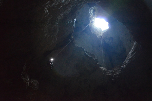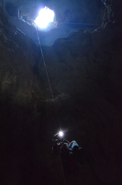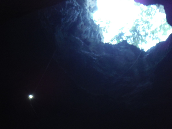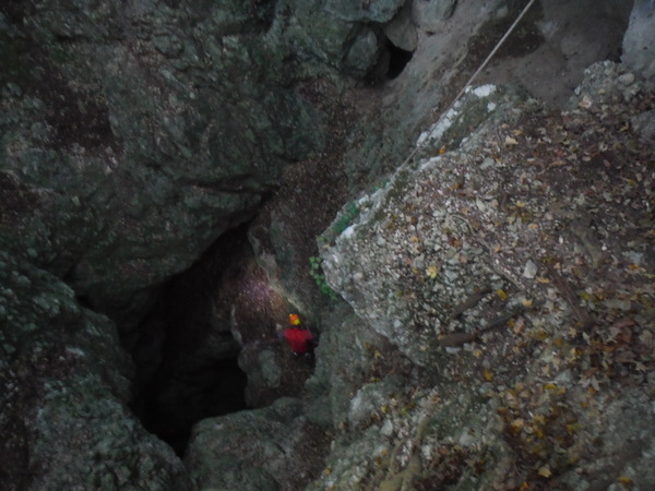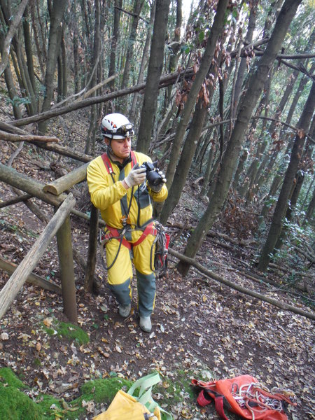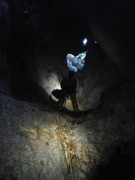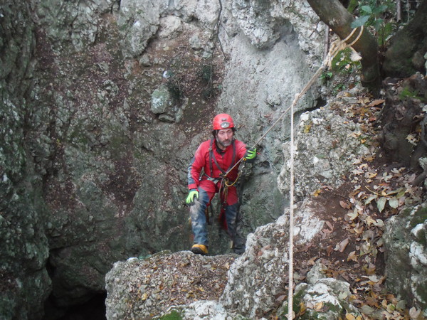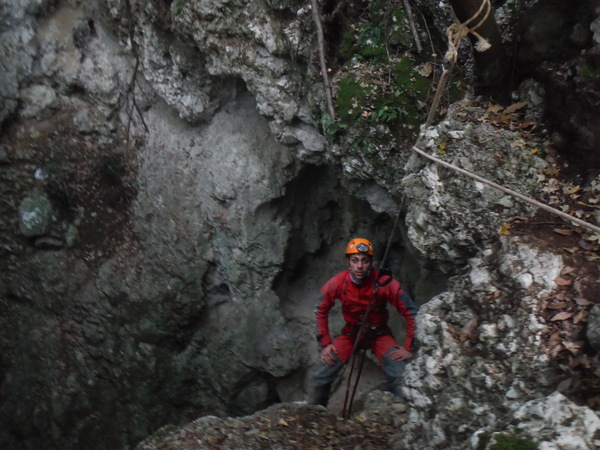 Giuseppe si attiva per armare la via principale dal mero piccolo, parte legando la corda ad un albero un poco distante dal pozzo, utilizza un altro albero sul bordo per frazionare e poi scende verso sinistra, nella spaccatura che porta al mero grande. Giulio ritorna con le corde, sono 2 da 40m. Anche giuntate non bastano ad arrivare al fondo del mero grande, pero’ vado ugualmente. Mi bardo con tutto il necessario e parto. Pochi passi e sono all’imbocco del mero grande. La mia intenzione iniziale era di armare dalla spaccatura a sinistra che avevo visto la volta scorsa ma visto che le corde non bastano mi e’ venuta un’altra idea. Partiro’ dall’imbocco “classico” e poi tentero’ di spostarmi lateralmente a raggiungere i miei amici. Prima di tutto unisco le 2 corde e faccio un bel nodo in fondo alla seconda. Parto da un alberello e scendo i primi 3 metri di piano inclinato che precludono alla verticale. Sul sasso che segna il confine del cambio di pendenza c’e’ uno spit, lo utilizzo con l’unico anello con bullone per fare il primo frazionamento. Poco piu’ sotto mi fermo, la corda inizia a toccare, decido di mettere un fix. Il trapanino svolge egregiamente il suo lavoro. Posiziono attacco e corda e quindi proseguo. Alla mia sinistra ecco la roccia da cui si puo’ partire con l’armo del pozzo senza che siano necessari altri frazionamenti. Cerco un po’ di spazio tra i tanti spit dove posizionare i fix e proseguire con l’armo. Metto il primo, metto anche il secondo. Faccio un topolino, regolo le asole e le inserisco nelle maglie rapide. Accidenti, l’asola piu’ lunga struscia leggermente sulla roccia, per un pozzo di piu’ modeste dimensioni non ci farei nemmeno caso, pero’ meglio essere prudenti. Smartello la roccia provando ad eliminare la sporgenza, molto meglio, ma ancora non sono del tutto contento. Ho ancora 6 o 7 maglie rapide, ne faccio una catena. Ora posso riposizionare il topolino senza che le asole tocchino la roccia. Un ultima controllatina e parto per la discesa fermandomi dopo qualche metro per fare delle foto.