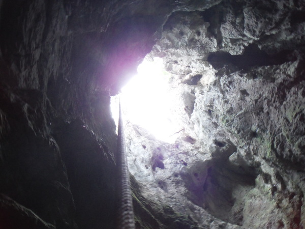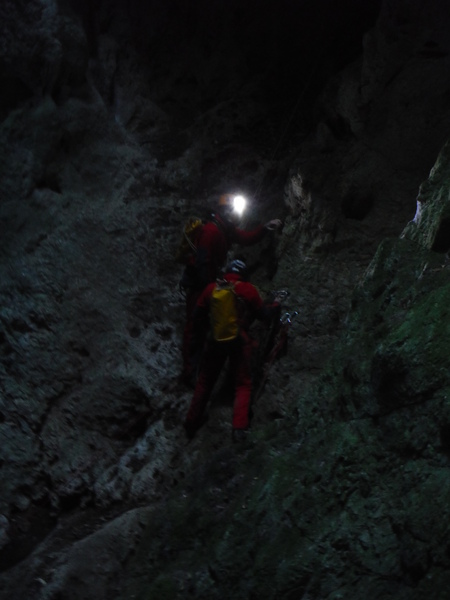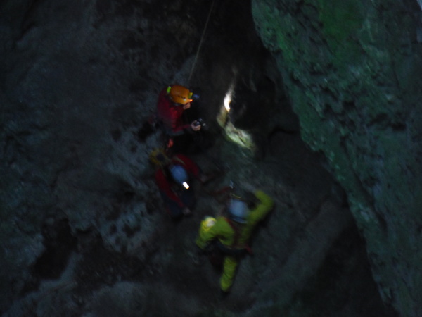 Tra qualche foto e lo spuntino trovo anche la spiegazione agli sbuffi di vapore. Giulio mentre scendeva ha fatto un piccolo buco sul tappo della bottiglia d’acqua e poi in un miracolo di coordinazione e’ riuscito a farla zampillare con discreta continuita’ sul discensore e quindi sulla corda. Pensandoci ora non so quanto questa cosa sia buona per la struttura del discensore, pero’ e’ indubbio che sia andato tutto bene comunque! Ma torniamo a noi, tra spuntino, foto, un po’ di chiacchiere e’ passato del tempo, inizio a sentire freddo. quasi quasi risalirei. Mentre formulo questo pensiero Simone mi batte nel tempo e ci annuncia che sta per risalire. Chiedo a Giulio e Giuseppe se posso risalire dopo Simone. L’alternativa sarebbe di cambiarmi e mettermi qualcosa di asciutto che inzupperei in risalita. Sembra che a loro non dispiaccia e quindi mi muovo un po’ per scaldarmi mentre aspetto che Simone dia la libera. Eccola, finalmente. Mi attacco alla corda saltellando come un matto per recuperarne il piu’ possibile e fare una partenza dignitosa. Riesco a staccarmi da terra, Giulio si offre di tenermi la corda per i primi metri, non mi oppongo di certo. Risalgo faticosamente, non ricordavo quanto lo fosse, e’ probabile che la ventina di anni in piu’ dia il suo contributo. Tra una sosta, uno sbuffo ed un ansimo arrivo infine al frazionamento. Alla cengia c’e’ Simone che mi aspetta. Mi avverte di stare attento perche’, passato il frazionamento c’e’ il rischio di perdere l’equilibrio e cadere sulla destra nel vuoto. Mentre passo facendo la dovuta attenzione commentiamo che sarebbe opportuno mettere un altro attacco per evitare la possibilita’ di caduta pero’ non abbiamo con noi il necessario e quindi rimandiamo alla prossima occasione. Prima di dare la libera aspetto che Simone parta poiche’ il primo tratto scarica un poco. Approfitto per fargli qualche foto.