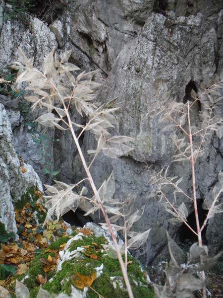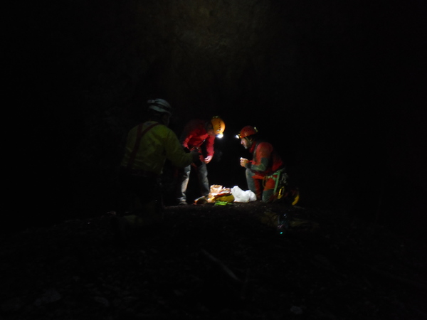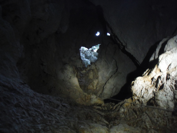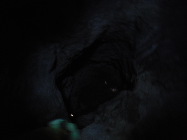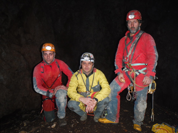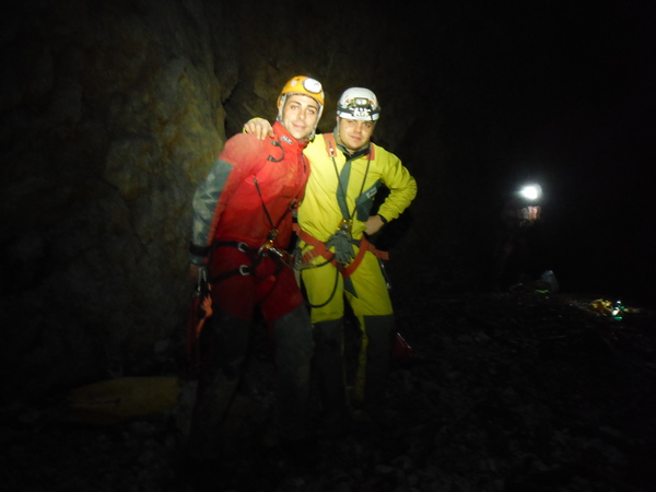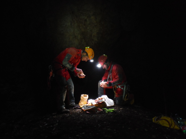 Per ingannare l’attesa hanno gia’ girato in lungo ed in largo tutto il fondo. Ora si stanno dedicando al pranzo a base di pane e salsicce. Nonostante ci sia la loro luce quando faccio per allontanarmi un po’ mi accorgo che devo accendere la mia. Provo, nulla. Strano, eppure sono ben sicuro di aver caricato la batteria e comunque non era mai successo che fosse tanto scarica da non accendersi nemmeno. Simone mi racconta che e’ successa anche a lui la stessa cosa. Probabilmente si tratta di una partita di batterie difettosa. Mi metto l’anima in pace e sostituisco la grossa batteria al litio in dotazione con 2 delle ministilo che porto sempre con me. Ora ho di nuovo la luce. Passiamo qualche minuto a fare foto, Simone mi mostra le sue, sara’ il fotografo, sara’ la macchinetta ma le sue sono incomparabilmente piu’ belle delle mie! Ve ne mostro alcune