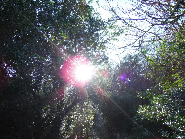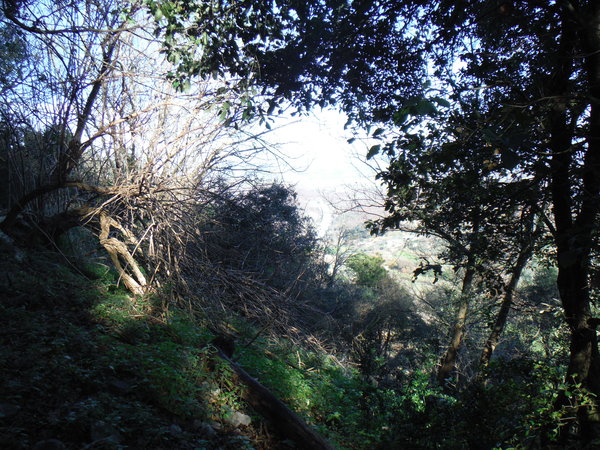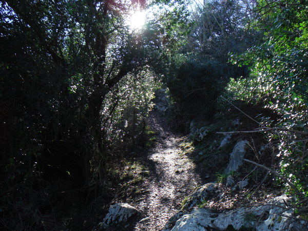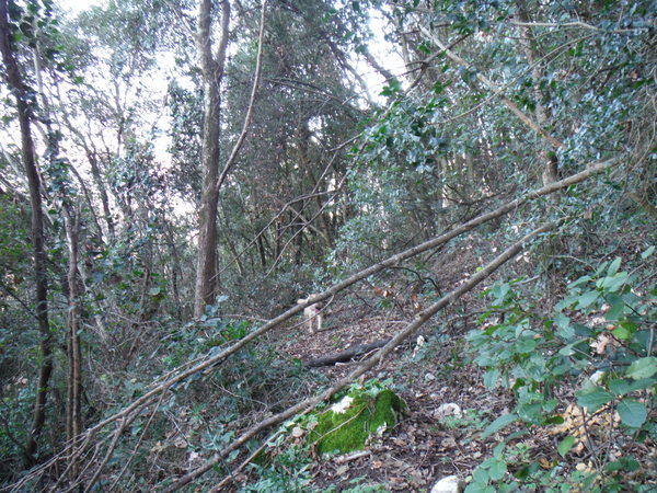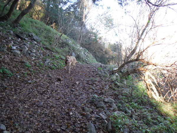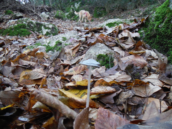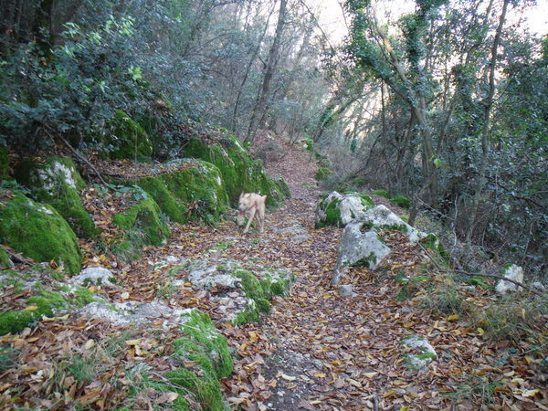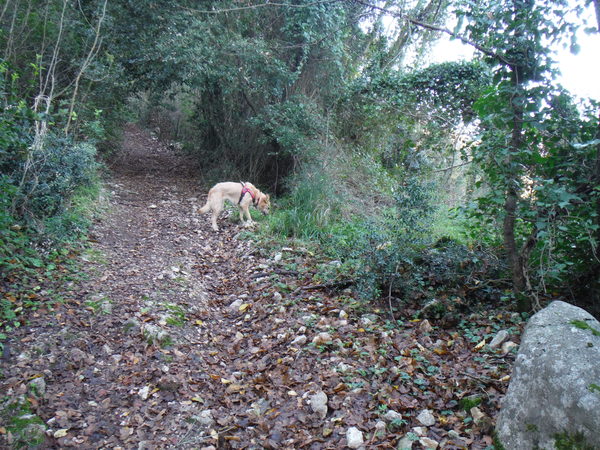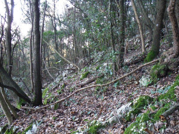 Mi tengo alla quota dell’attacco del sentiero. Luna inizia il suo andirivieni frenetico, sembra contenta. In alcuni punti il terreno sembra arato, devono essere i cinghiali che impazzano da queste parti. Qualche metro piu’ in basso rivedo il sentiero, davanti a me la vegetazione si infittisce. Provo a continuare dritto ma diventa complicato. Decido di scendere, la terra e’ scivolosissima, un paio di volte rischio lo scivolone. Luna con la trazione integrale va decisamente meglio! Continuo tranquillamente sul comodo sentiero, provo a confrontare i miei ricordi con quello che vedo ma non trovo riscontri. Proseguo mentre Luna sfreccia felice avanti ed indietro.