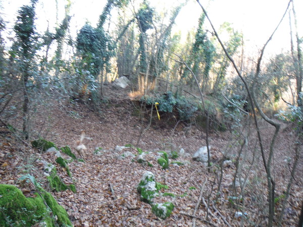 Ci provo, male che vada scendero’ un po’ ad intercettare il sentiero dell’andata. Dopo qualche decina di metri il sentiero scompare tra alberi crollati e spini vari (stracciabraghe, li chiamano con ogni ragione!). Testardo continuo a camminare. Quando anche Luna rimane impigliata in un groviglio di spini inizio a pensare che e’ meglio desistere. Proseguo ancora un po’, quando incontro un nuovo muro spinoso inizio a scendere a sinistra. Luna si ferma sul ciglio di qualcosa e guarda in basso. Incuriosito mi avvicino. Ma brava Luna, ha trovato la grotta che cercavo! Siamo sopra ad una conca che potrebbe essere quel che resta di una fornace per la calce. Sulla parte piu’ alta si apre la crepa che spero si possa rivelare grotta.