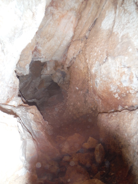 Scendo nella conca e inizio ad armeggiare con lo zaino per recuperare il casco, ne approfitto per bere e dare da bere a Luna. Non ho portato la tuta perche’ non avevo molte speranze di trovare la grotta e comunque non ero partito con l’intenzione di fare cose impegnative. Mi metto il casco, una ultima occhiata alla maglietta che tra poco non sara’ piu’ pulita e poi mi infilo. E’ stretto, come ricordavo, anzi, di piu’. Non arrivo fino in fondo perche’ dei perfidi spuntoni mi artigliano la maglia. Mi accontento di scattare un paio di foto ricordo.