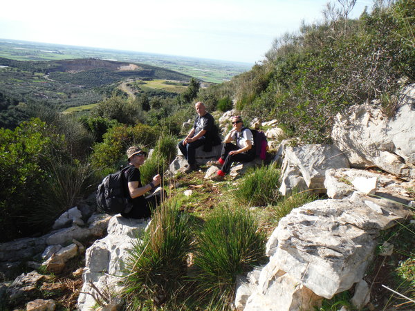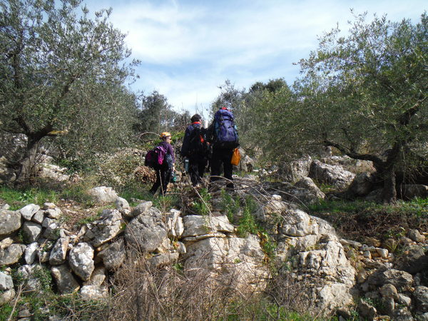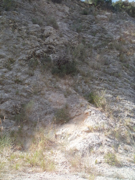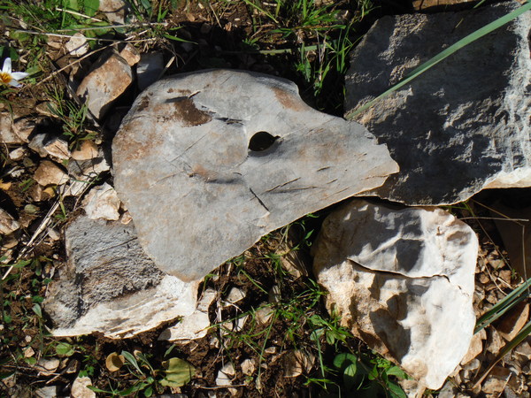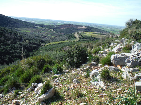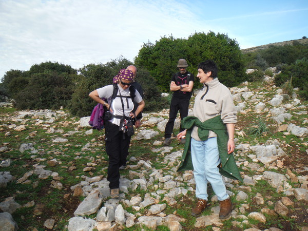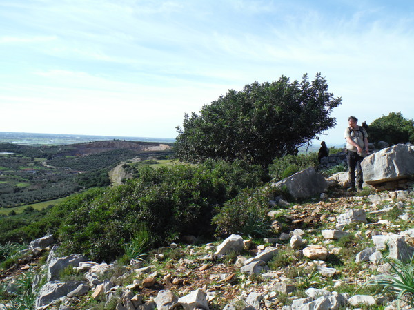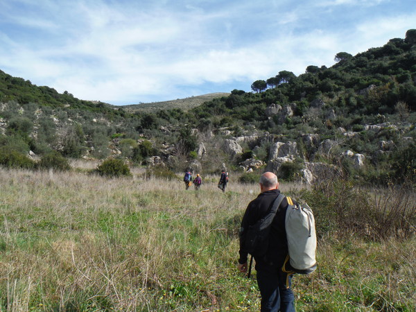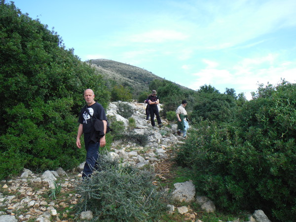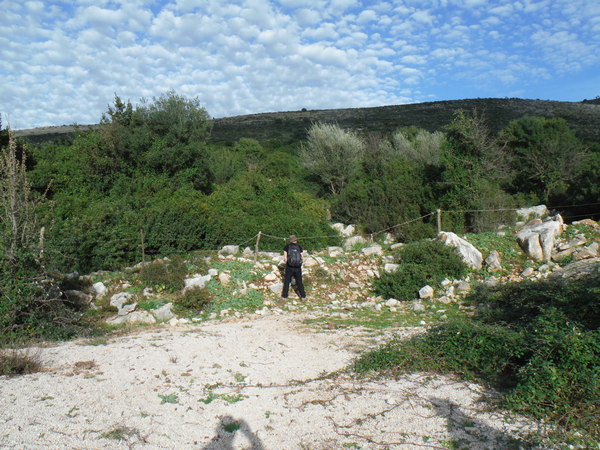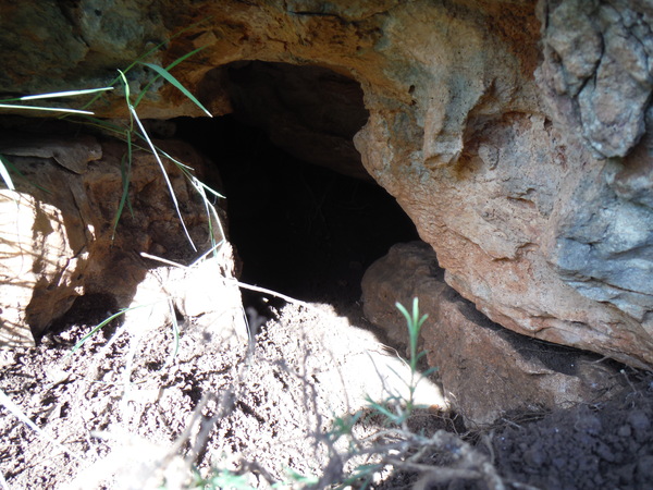 Alla destra del cancello, in linea con lui, c’e’ una valle infossata dove i miei amici sono stati la volta scorsa ed hanno trovato un paio di grotticelle nuove. Il nostro obiettivo invece dovrebbe trovarsi a mezza costa della collina che si inerpica dal fosso esplorato la volta scorsa. Ci equipaggiamo leggeri perche’ la scarpinata si preannuncia assolata e faticosa. Oltrepassiamo il cancello cercando il passaggio migliore tra la miriade di cespugli che tappezzano la nostra collina.