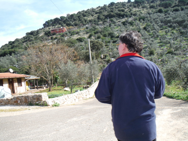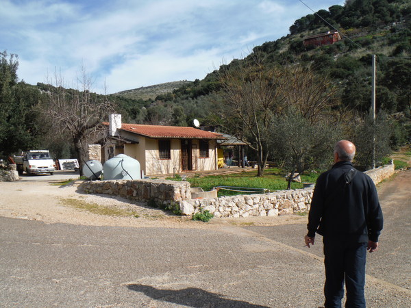 I nostri hanno nel frattempo deliberato che si deve tornare indietro al bivio che avevamo commentato strada facendo, non ricordo a quale proposito. Si tratta della Via VidiMina. Inganniamo il tempo dell’avvicinamento commentando che il nome VidiMina e’ corretto in quanto Mina e’ lontana dagli schermi da tempo, ricamando sopra questa scemenza riusciamo quasi a strappare un sorriso al Pintus! Fermiamo le macchine in corrispondenza di una curva a sinistra, quasi ad angolo retto. In mezzo alla curva, sulla sinistra si apre il viottolo di ingresso ad una casetta di campagna che si intravede abitata da un giovane capofamiglia attorniato da allegri bimbi, chiassosi cani e gattoni che fanno la pennichella pre-prandiale godendosi il sole. Gli Astici non sono sicurissimi del posto, Paola approccia il capofamiglia chiedendo informazioni. Ritorna con le idee piu’ chiare. Il posto e’ giusto, possiamo prepararci per la grotta.