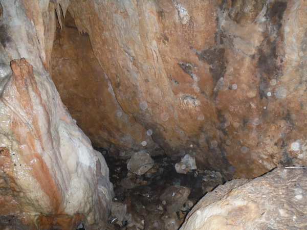 Alla prova del sasso il fondo sembra essere fangoso ma non e’ escluso che possa proseguire orizzontalmente lungo la frattura d’ingresso per poi riprendere la verticale piu’ in la’. Torno dai miei amici, facciamo il punto.