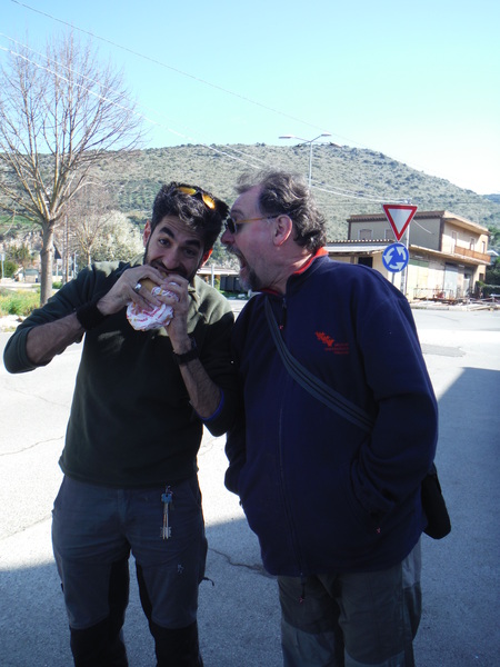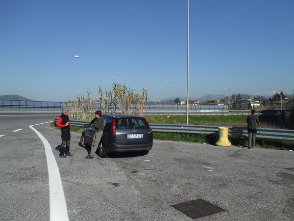 Breve summit rigorosamente al sole e decidiamo che andremo con 2 macchine, quella di Fabio, in arte Ersimio, e quella di Laura, in arte…Laura! Maria e Gianni andranno con Valentina e Fabio, noialtri ci inzepperemo comodamente nella macchina di Laura. Si parte, prossimo appuntamento all’uscita dell’autostrada a Ferentino. Arriviamo per primi ma dobbiamo attendere solo pochi minuti, ne approfittiamo per gustarci il sole.
