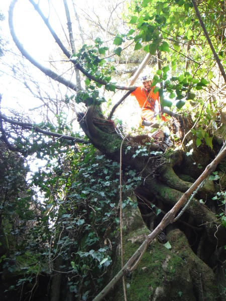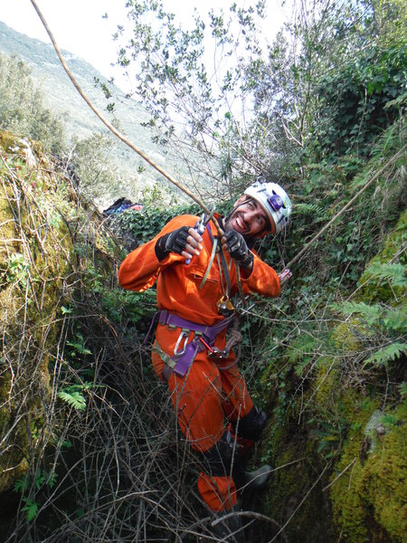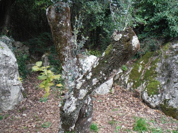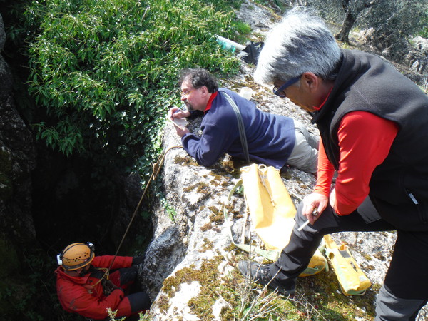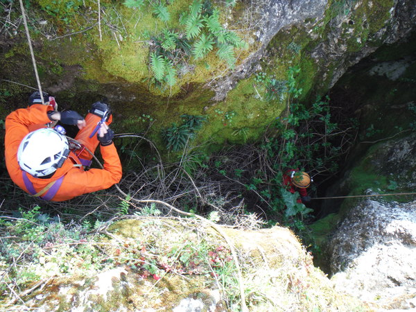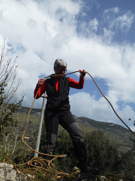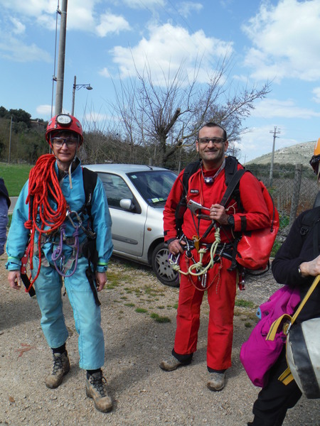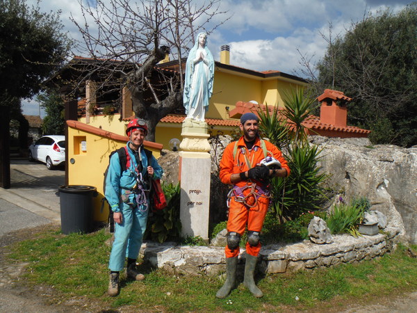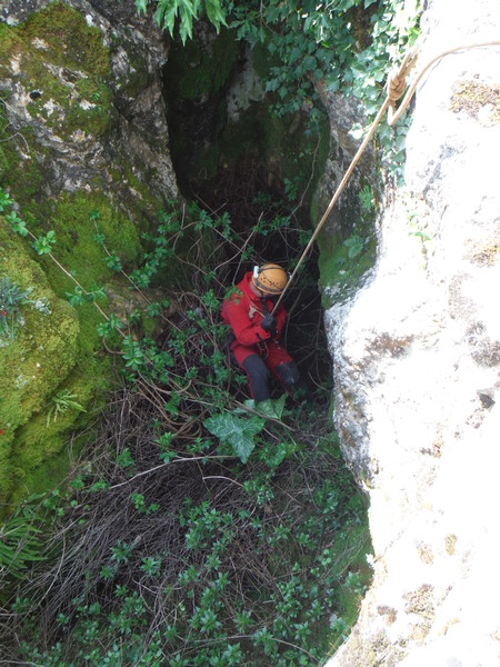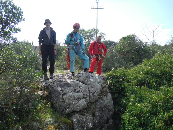 Guidati da Gianni, armato di carte topografiche con segnati i punti da vedere, entriamo in un campo a lato sinistro della strada. Il posto sembra promettente, pero’ si fanno avanti in parecchi per visitarlo cosi’ mi astengo, ce ne saranno sicuramente altri. Con Gianni ritorniamo in strada e la proseguiamo. Poco piu’ avanti, quasi contemporaneamente, Gianni ed io notiamo una conformazione che fa pensare grotta, io passo oltre pensando pessimisticamente ad un altro bucaccio, Gianni invece gli da’ fiducia e va a vedere arrampicando il breve dislivello di roccia. La sua fiducia sembra ripagata, nella roccia si apre un buco di circa 5 metri per 2. Salgo anche io a vedere. L’interno e’ pieno ma per fortuna solo di piante. La prova sasso non accende grandi speranze, pero’ forse, li’ dove le piante sono piu’ fitte…Decidiamo di mettere una corda e di scendere. Da un lato del buco c’e’ un alberello sul bordo, utilizziamo quello per armare. Ivano, che ci ha raggiunti, si offre per scendere. Nel frattempo anche gli amici che si erano fermati al buco nel terreno vicino vengono a vedere di cosa si tratta aggiornandoci del fatto che non hanno trovato cose eclatanti, il solito buco che chiude dopo pochi metri. Hanno portato altro materiale, cosi’ metto un fix nella parete opposta a quella dove scende Ivano e scendo pure io. Purtroppo anche questo buco non ci regala sorprese, chiude ed e’ a malapena catastabile. Di buono c’e’ che e’ un posto piacevole e quindi ci prendiamo tutto il tempo per fare qualche foto.