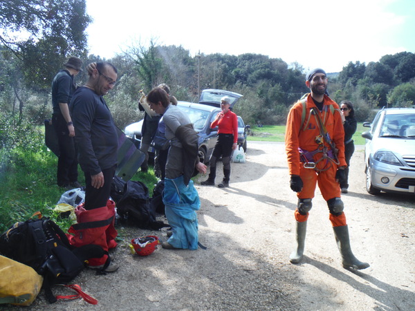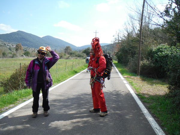 Mentre rifiato vedo gli altri che tornano, il buco non ha portato alcuna piacevole sorpresa. Li aggiorno su quella che ho nominato “Buca della discarica” (quale che sia il nome a catasto, si merita il nuovo appellativo!). Gianni ora e’ intenzionato a spostarsi piu’ avanti sulla strada per vedere i successivi buchi. Decidiamo di seguirlo un po’ tutti. Prima di andare vado da Ivano per aiutarlo a disarmare ma risponde che preferisce fare lui, cosi’ lo abbandono per nuove avventure. Vedo l’allegro e variopinto gruppo di speleo gia’ avviati lungo la strada, mi affretto a raggiungerli.