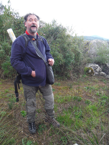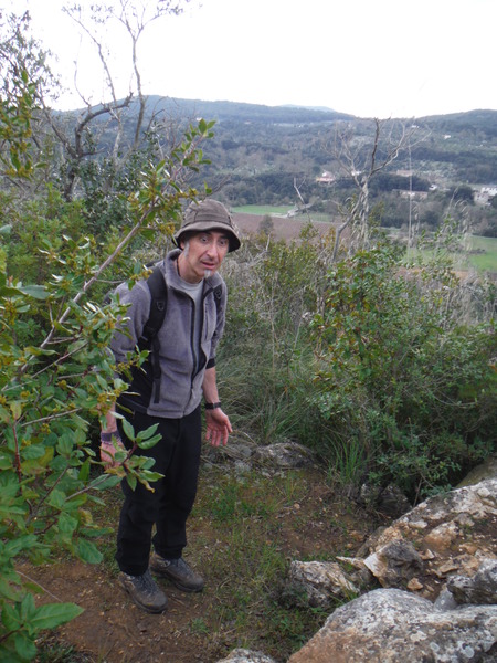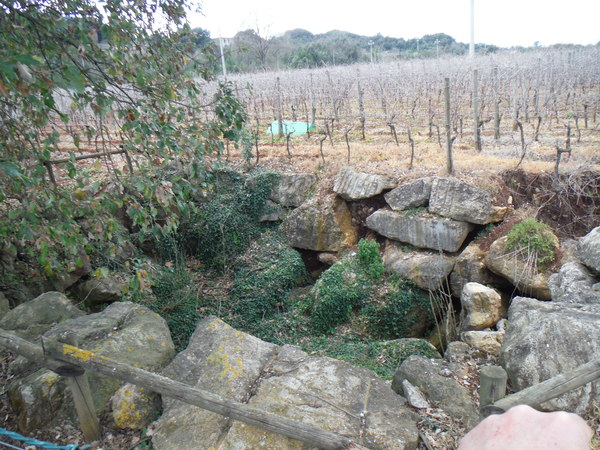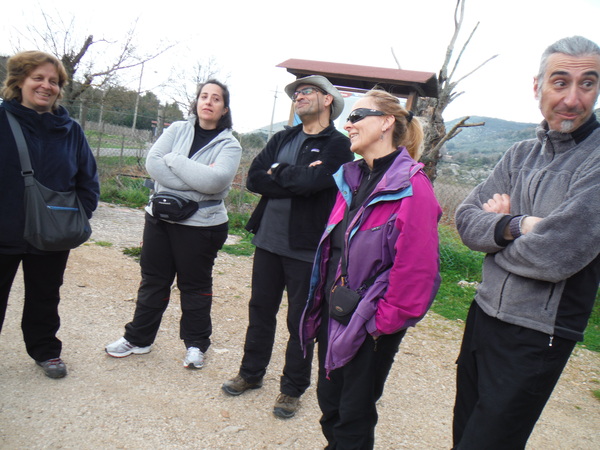 Faccio la prova a togliere la tuta, sono sudatissimo e sento freddo. Me la infilo nuovamente lasciando pero ‘ alla macchina tutto il resto della attrezzatura. Partiamo baldanzosi alla volta del carciofo, Valentina decide di rimanere nei pressi della macchina a scattare foto. Passiamo il carciofo, anche da vicino e’ un bel pinnacolo di roccia, ed arriviamo alle pendici della collina nei pressi di una pozza artificiale per la raccolta d’acqua. Il sentiero attraversa poi un vigneto i cui filari sono organizzati come un labirinto. Per una ventina di minuti ci perdiamo in lui. Ci vediamo ma non riusciamo a raggiungerci! Alla fine pero’ ne abbiamo ragione e sbuchiamo sul proseguo del sentiero. Ci ricompattiamo e continuiamo. Inizia la salita. Lungo il sentiero osserviamo possibili buchi, un’altra pozza d’acqua con girini ed altri animaletti, delle formazioni rocciose particolari di cui l’ottimo Ersimio ci rende edotti.
