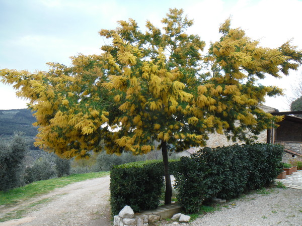 Alla fine sbuchiamo su una strada bianca. Prendiamo a sinistra verso le ville. Ci soffermiamo sulla prima ma poi decidiamo che non e’ la piu’ grande. La seconda magari non e’ la piu’ grande, ma e’ molto carina e vicino c’e’ una mimosa in fiore che e’ spettacolare.