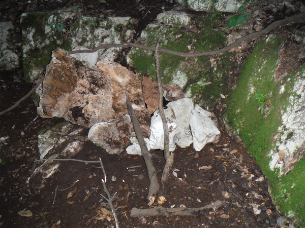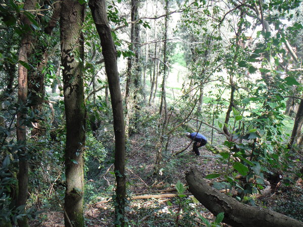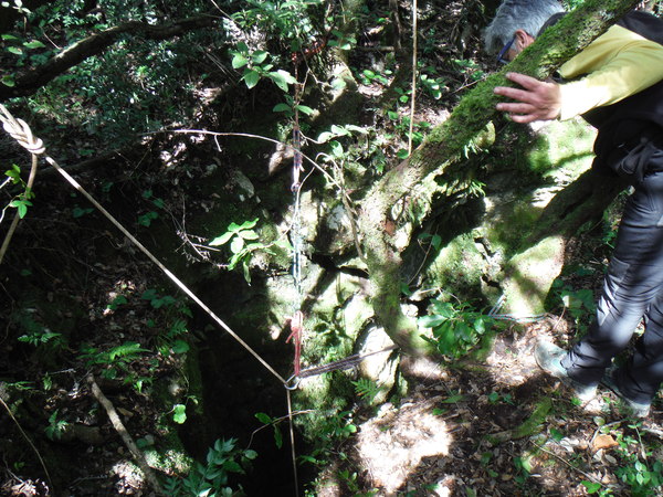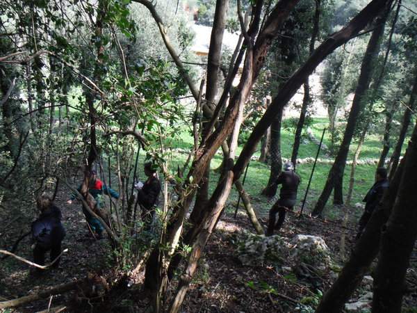 Strada facendo incontriamo un gruppo di persone impegnate in una guerra simulata “soft air”. Hanno dei mitra che sembrano minacciosamente veri e sparano raffiche di migliaia di palline bianche che inizialmente avevo scambiato per polistirolo. Quando ci accorgiamo di star passando in mezzo alla loro guerra facciamo rumore per farci sentire, finche’ uno di loro ferma gli altri avvertendoli che stanno passando dei “civili”. Passiamo velocemente ridendo sotto i baffi pensando che chiamarci “civili” quando siamo tutti infangati e bardati da grotta forse non e’ un appellativo che ci si attagli granche’. Dopo le macchine prendiamo un sentiero che costeggia la strada. Passiamo vicino ad una piantagione di alberi di fico (non ne avevo mai vista una prima) e sbuchiamo in una radura. Quasi subito ci immergiamo nuovamente tra gli alberi e a pochi metri troviamo finalmente la nuova chiavica da esplorare. E’ un buco nel terreno a forma di ovale allungato, largo 1 metro e lungo circa 4. Alla prova visiva e quindi a quella del sasso non risponde molto bene. Stimiamo sia profondo meno di 20 metri. Con Stefano ci prepariamo a scenderlo optando per un armo naturale sfruttando i numerosi alberi che attorniamo il buco. Mentre Stefano indossa l’attrezzatura io sistemo la corda. Stefano portera’ con se anche la sacca da rilievo cosi’ risalendo potra’ prendere i dati per poi disegnare e quindi documentare la nuova grotta. Mentre lui scende mi preparo anche io e quindi scendo a mia volta. Trovo Stefano sul fondo del pozzo. Gia’ la sua espressione mi dice che qui dentro non troveremo altro che immondizia ammucchiata. Iniziamo il rilievo del fondo poi risaliamo.