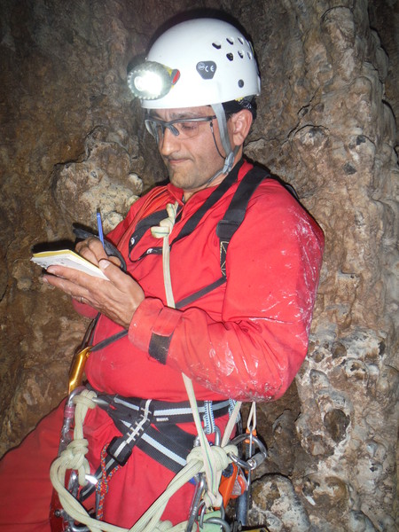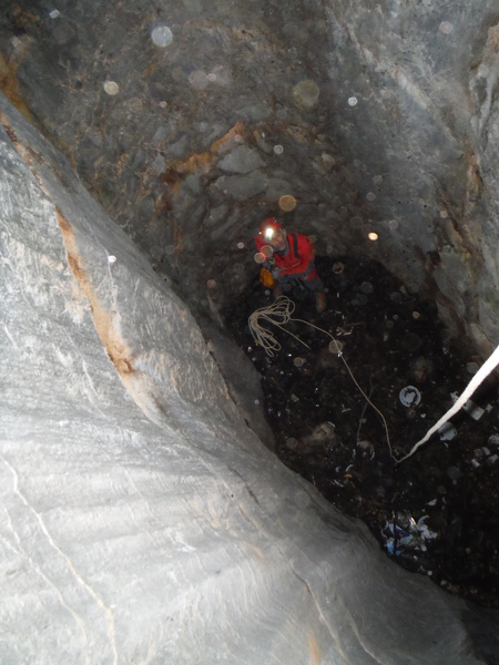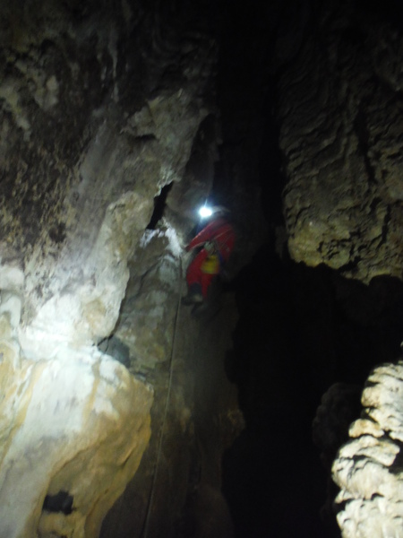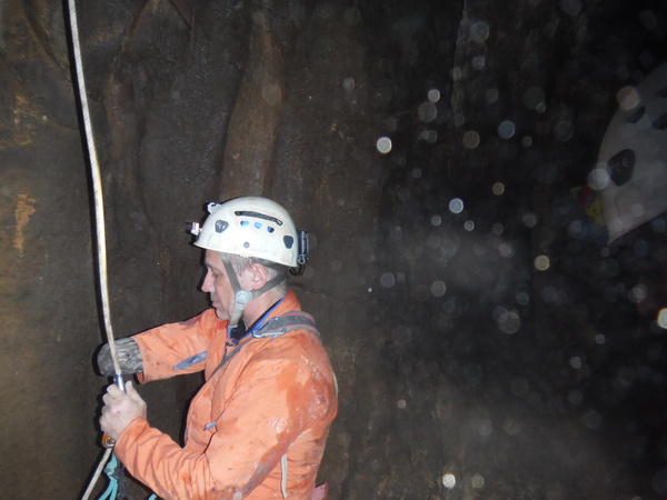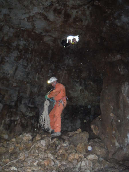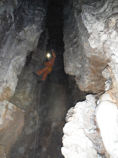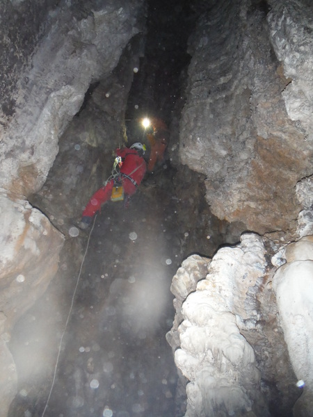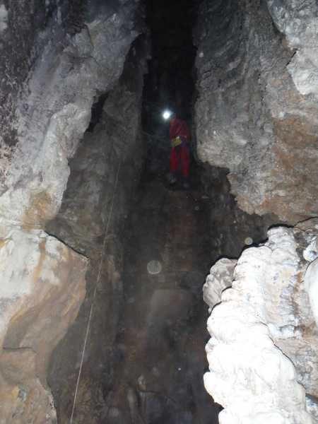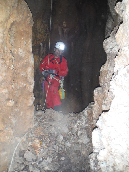 Dopo l’ingresso la parete spancia, praticamente i miei amici stanno camminando sulla volta della sala. Li rendo partecipi della scoperta e continuo la discesa. Arrivo su un mucchio di sassi che digrada verso il salto visto da sopra. Continuo a scendere cercando di far cadere i sassi piu’ instabili e mi fermo sul bordo del salto. Cerco un armo naturale per continuare la discesa rapidamente, non lo trovo. Serve piantare un altro fix. Mi sistemo in sicurezza e libero la corda per far scendere Max.