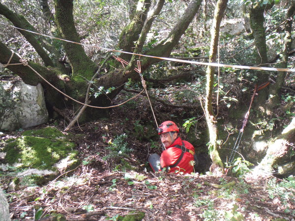 Quando capiamo che dietro al masso posticcio c’e’ veramente una grotta iniziano a fervere le attivita’. Dapprima cerchiamo di togliere il masso tirandolo a mano. E’ troppo pesante. Un rapido summit e decidiamo di ancorarlo ad una corda e tirarlo via cosi’. Attrezziamo il tutto e prendiamo a tirare come forsennati. Ancora non basta, oltre ad essere pesante e’ anche un po’ bastardo e si “incaglia” sulle altre pietre che contornano il buco. Riproviamo con 2 modifiche, Max si allongia al masso e lo solleva per quanto puo’, io lo aggancio con un cordino dall’interno e un nutrito gruppo tira la corda. Stavolta ce la facciamo, il masso rotola via tentando di schiacciare Max. Il buco rivela una sala ampia con un salto proprio di fronte a noi che sembra dare su un altro ambiente. Oltre non e’ possibile vedere ma c’e’ del nero che fa ben pensare. Si scatena un momento di euforia collettiva, sembriamo tanti bimbi al momento della apertura dei regali di Natale! Gianni propone di dedicare il nome della grotta al nostro accompagnatore, la proposta passa per acclamazione, la nuova grotta si chiamera’ “Chiavicozza di Guido”. Passato il momento dell’allegria ci attiviamo. Facciamo delle foto ricordo con Guido ed il suo amico, ci prepariamo per scendere ed armiamo il primo pozzo. Ho proprio voglia di scendere, sono gia’ pronto e mi faccio avanti. Ok, vado! Appena appeso alla corda ci scambiamo foto, io ne faccio a loro fuori, loro ricambiano.