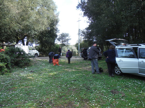 Mentre eravamo in esplorazione sono praticamente arrivati tutti. Il nostro gruppone si e’ allegramente riformato. Ritorna anche Gianni da un lungo giro alla ricerca del terzo buco non ancora individuato. La sua perlustrazione non ha portato a nuove scoperte, lo aggiorniamo sul pozzo appena sceso e poi ci dedichiamo al meritato pranzo. Durante la lieta libagione decidiamo il nome delle grotte esplorate finora. Quella scesa da Maurizio, Max e gli altri sara’ la “Chiavica del Re Cinto”, quella scesa da Stefano e me avra’ nome “Chiavica del vitello”. Dopo il pasto facciamo un rapido punto della situazione. Sembra non ci sia molto da fare nei dintorni. Gianni propone di tornare alla fonte nella speranza di incontrare nuovamente il simpatico signore, si chiama Guido, che ci aveva indicato le grotte le volte scorse. Torniamo rapidamente alle macchine e torniamo indietro.