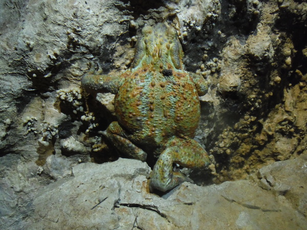 Quando e’ accanto a me gli indico dove ho gia’ saggiato la roccia per piantare il fix. Si occupa lui di proseguire l’armo poiche’ e’ su corda ed e’ piu’ comodo. Scende ancora qualche metro ma la corda non basta. Si ferma in un punto tranquillo mentre fisso la seconda corda e continuo la discesa del salto. Metto un deviatore su un attacco naturale, regge ma non e’ un granche’. Scendo fino al fondo del salto e Max mi raggiunge. Mentre scende intravede un appiglio migliore per il deviatore e sistema l’armo. Mentre lo aspetto mi guardo intorno, corro quasi, verso il “nero” che tanta speranza ci aveva dato da fuori…E’ solo una nicchia senza prosecuzione alcuna. La nostra bella grotta finisce li’! Aggiorno Max che nel frattempo e’ arrivato. Ci mettiamo al riparo perche’ deve scendere Fabio con l’attrezzatura da rilievo e non vorremmo ricevere pietre sulla zucca. Scopriamo che il nostro rifugio ha gia’ un ospite. Un simpatico rospo ci guarda allarmato.