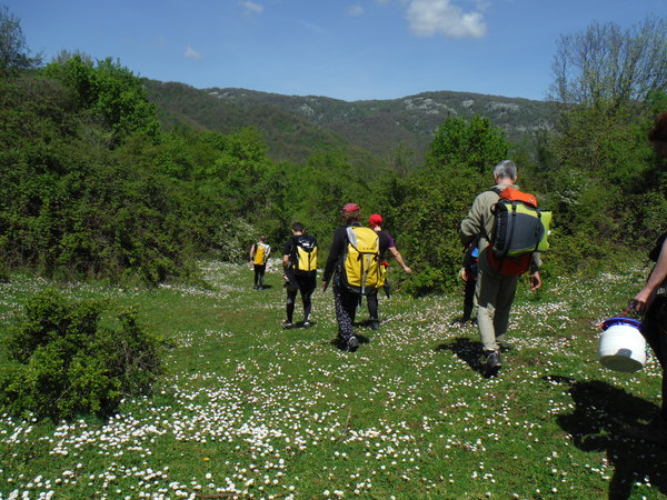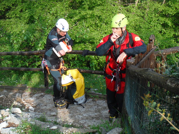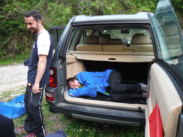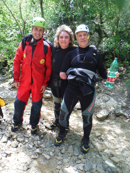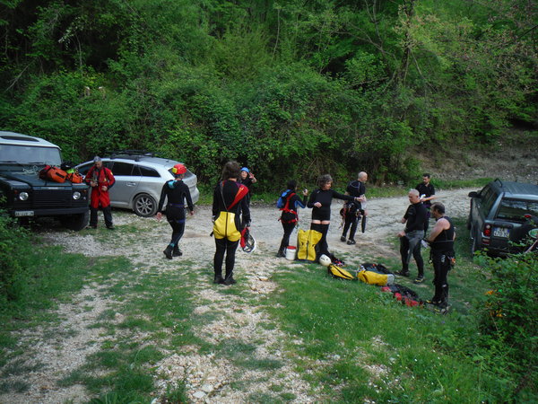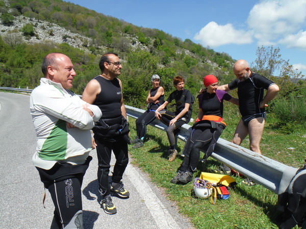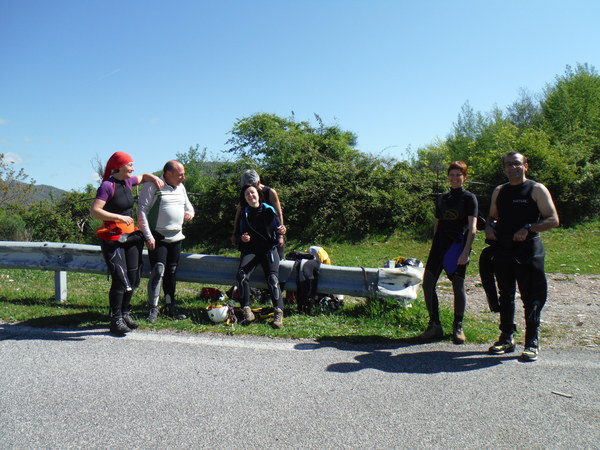 Ed ora a noi…Erano trascorsi almeno 15 anni dall’ultima volta che avevo fatto una forra in generale ma soprattutto questa in particolare. Probabilmente e’ stata la nostalgia, oltre alla prospettiva di passare una giornata in ottima compagnia, a farmi decidere. Per una volta la grotta potra’ aspettare, mi son detto. Forte di questa considerazione il giorno prima mando una mail per aggregarmi, poi, a casa, faccio disperare Betti per cercare la muta e rimediare un po’ di attrezzatura acconcia. Alla fine trovo una muta in 2 pezzi un po’ incotechita, un imbrago da grotta un po’ conciato dalle strettoie, un discensore a 8 e le scarpe da montagna che uso per andare in grotta. Negli ultimi tempi ho cercato di dare uno sguardo agli aggiornamenti delle tecniche e dei materiali per fare torrentismo. Dal poco che sono riuscito a vedere di sicuro con la mia attrezzatura saro’ il classico esempio di come non si deve fare torrentismo, ma sono certo che riusciro’ a divertirmi ugualmente! La mattina sveglia all’ora solita, le 6.30, cosi’ avanza tempo per fare colazione in famiglia. L’appuntamento e’ alle 8.30 all’uscita di Castel Madama della autostrada Roma-L’Aquila. Per una volta arrivo puntuale invece che in imbarazzante anticipo, anche queste son soddisfazioni. Appena passato il casello trovo nessuno ma sono sicuro che qualcuno debba esserci quindi mi guardo attorno. Alla mia destra, piu’ in basso, c’e’ un ampio spiazzo con delle macchine ed alcune persone attorno, non li distinguo ma do’ per scontato siano loro. Imbocco la strada e poi entro nel parcheggio. Infatti eccoli, sono loro che si gustano il bel sole caldo alla faccia delle previsioni di pioggia. Mancano ancora le macchine di Veruska e Fabrizio e Claudia ed Emilio, ne approfitto per radunare tutta la mia roba e trasferirla nella Sbardy Mobile ad oggi in possesso di Roberto. Con Roberto non ci conosciamo ma rimediamo in un attimo. Mentre faccio il mio solito trambusto con l’attrezzatura arrivano anche gli altri. C’e’ anche un aggiornamento, Rosa e Stefano per questa volta non saranno dei nostri, peccato. Chiudo la macchina, monto sulla gloriosa Sbardy Mobile e via. La nostra direzione e’ verso S. Polo dei Cavalieri, la strada per il monte Morra, se internet non mi inganna! Mentre ci perdiamo una decina di volte cercando la strada giusta, con Roberto facciamo un po’ di “amarcord” rivangando vecchi ricordi su Sbardy ed una carrellata sui trascorsi della speleologia laziale negli ultimi 20 anni. Apprendo che Roberto fa parte del soccorso dal 2000, anno in cui ho lasciato io, anche per questo non ci siamo mai incrociati. E’ anche un esperto speleosub e mi descrive un poco delle evoluzioni tecnologiche che ci sono state nella subacquea negli ultimi 20 anni, molto interessanti. Arriviamo finalmente a S. Polo ed a percorrere la celeberrima strada per il monte Morra. In corrispondenza ad un curvone a sinistra c’e’ uno spiazzo dove parcheggiare. C’e’ anche l’indicazione per la “madonna dei Ronci”. Sembra che siamo arrivati. Ora dobbiamo “solo” trovare dove usciremo per portarci le macchine con i vestiti asciutti. Max ha un amico che gli ha consigliato l’itinerario. Sembra gli abbia detto che dobbiamo cercare i fili dell’alta tensione in prossimita’ di un monumento agli elicotteristi per trovare il posto cercato. Andiamo in cerca con la sola Sbardy Mobile. Cerca che ti ricerca il posto non sembra esserci. Arriviamo a cercare fino a S. Polo e poi torniamo indietro. Max chiama il suo amico. Si erano capiti male, il posto si trova nei pressi di Vicovaro. Muniti di nuove indicazioni un manipolo di eroi, gli autisti, partono con tutte le macchine alla volta di Vicovaro. Stavolta me ne rimango buono buono allo spiazzo di partenza con gli altri ad attendere il ritorno dei “driver” e a gustarmi il sole. Mi porto avanti con i preparativi indossando la salopette della muta, con gran fatica, e la tuta speleo. Cerco di convincere Fabio ad andare in esplorazione verso il sentiero ma dopo pochi passi ci troviamo davanti un bivio che infrange le aspirazioni esplorative del buon Fabio. Alla fine devo convenire che probabilmente ha ragione lui a non voler sprecare inutilmente le nostre esigue forze. Torniamo indietro riunendoci agli altri “attendenti” e ci dedichiamo a prendere il sole, a qualche chiacchiera oziosa ed uno spuntino.