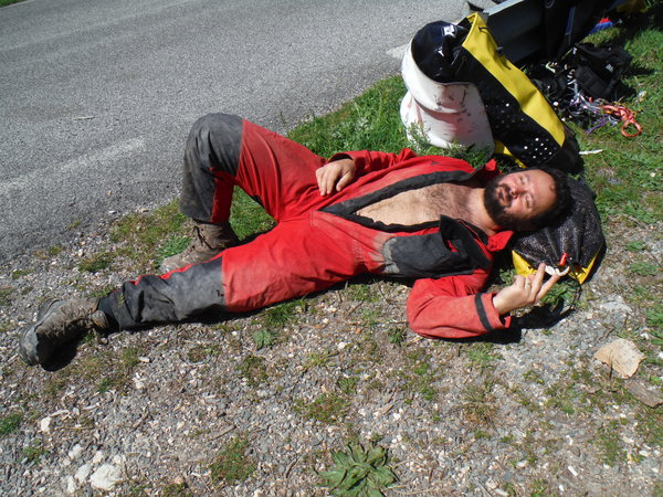 Passa il tempo, nelle mute si suda, ma che fine hanno fatto gli autisti? Maria li chiama. Hanno dovuto penare un po’ ma ora sono sul posto e quasi pronti a fare ritorno. Tra 20 minuti ci ricongiungeremo. Mi stendo a prendere il sole mentre gia’ i piedi bollono nei calzari arroventati. Arrivano? Si, si sono loro! Scendono dalla macchina in costume, hanno lasciato i propri vestiti asciutti alle macchine.