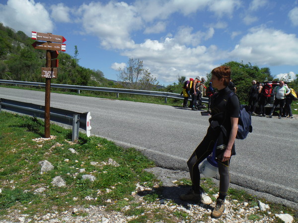 Terminano la vestizione raccontandoci nel frattempo le recenti vicissitudini. Siamo tutti pronti, partiamo alla volta della forra imboccando il sentiero che recita “Madonna dei Ronci – 0,45h”.