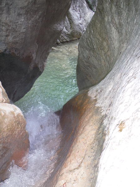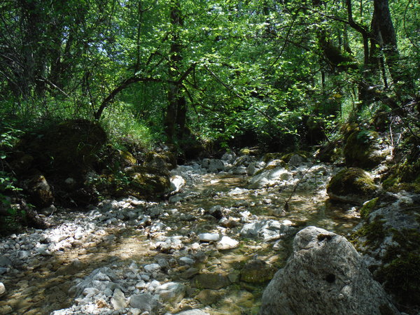 Cammina, cammina, cammina, inizio a pensare che la dicitura sul cartello “0,45h” non fosse buttata li’ a caso. Fortuna che il sentiero continua a dipanarsi quasi in piano e al coperto degli alberi. Senza volere ci sfilacciamo un po’ dividendoci in 2 gruppi. Io mi ritrovo in quello avanti. Seguiamo sempre il sentiero segnato che ci sembra evidente e ben segnato ma non deve essere cosi’ perche’ il gruppetto che segue rischia di perdersi ad uno degli innumerevoli bivi e quindi dobbiamo darci da fare per favorire il ricongiungimento. A questo pensano Luisa e Roberto. Nel frattempo Max ed io andiamo a cercare l’inizio della forra. Lasciamo la gradita ombra dell’albero che abbiamo scelto per la sosta e scendiamo, sempre seguendo il sentiero. Alla fine della discesa si incrocia un piccolissimo corso d’acqua