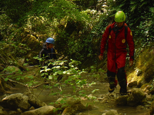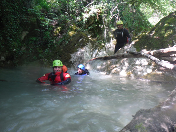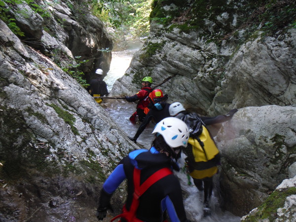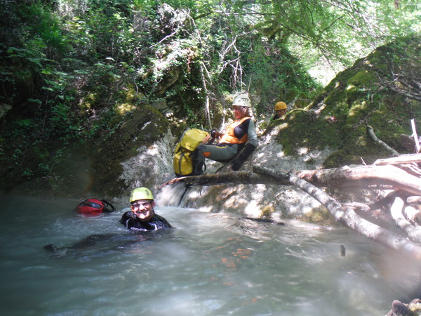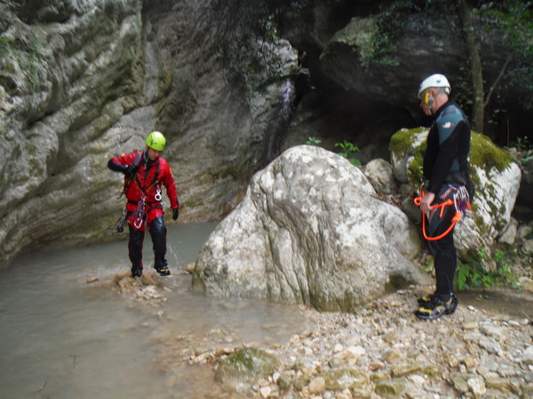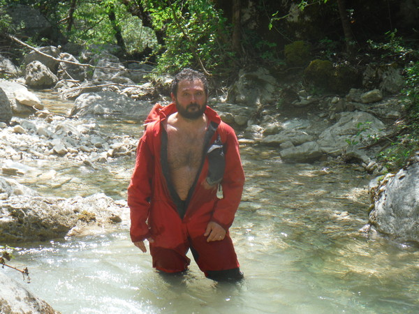 ed una volta attraversatolo il sentiero riprende in salita. Max mi ha un po’ distanziato, deve essere andato avanti sul sentiero, faccio per seguirlo ed intanto lo chiamo a gran voce. Mi avventuro in salita e ci incontriamo quasi subito perche’ sta tornando indietro. Torniamo al minuscolo corso d’acqua. Ipotizziamo, o meglio, decidiamo, che il rigagnolo vada a confluire nella nostra forra. Max va a verificare che piu’ avanti sia percorribile, io torno indietro a chiamare gli altri. Quando arrivo all’albero oramai il ricongiungimento col gruppo disperso e’ cosa fatta. Aggiorno tutti e andiamo. Arrivati al nostro rigagnolo iniziamo a seguirlo fino a raggiungere Max poco piu’ avanti. Si fa sosta perche’ tutti possano indossare il resto della muta. Mentre aspetto mi guardo attorno. Poco piu’ avanti sulla sinistra c’e’ una cascatella formata da uno sbarramento artificiale. Mi sembra proprio di ricordarlo. Inizio ad avere qualche ricordo del posto che mi rassicura sul fatto che dopo tutto siamo riusciti a raggiungere la forra. Poco piu’ avanti trovo una piccola pozza d’acqua, finalmente. Mi ci butto allegramente dentro per far scendere la temperatura interna oramai al limite del bollore.