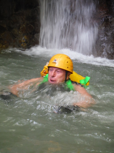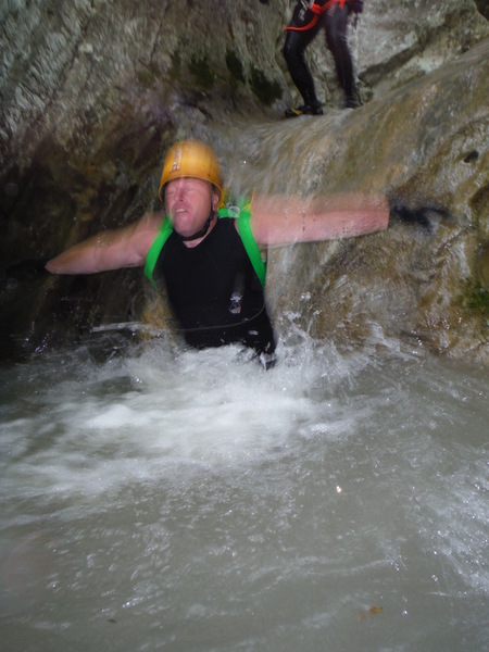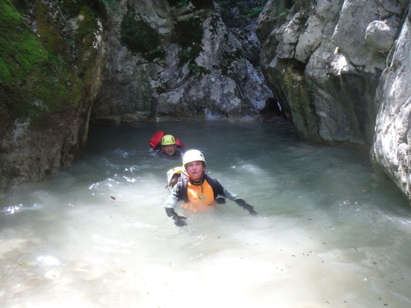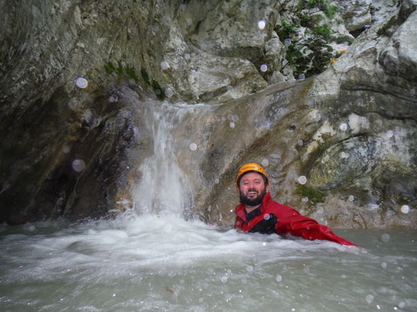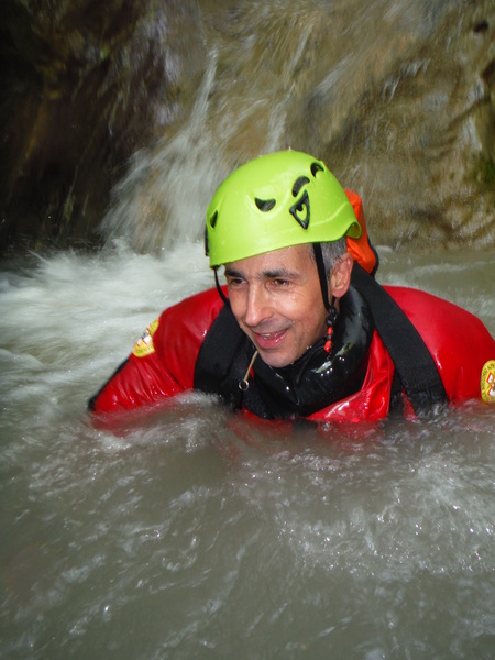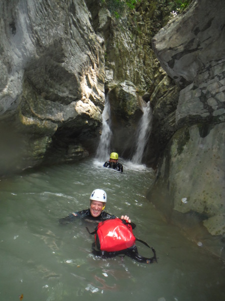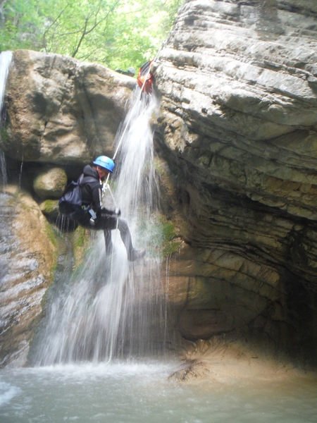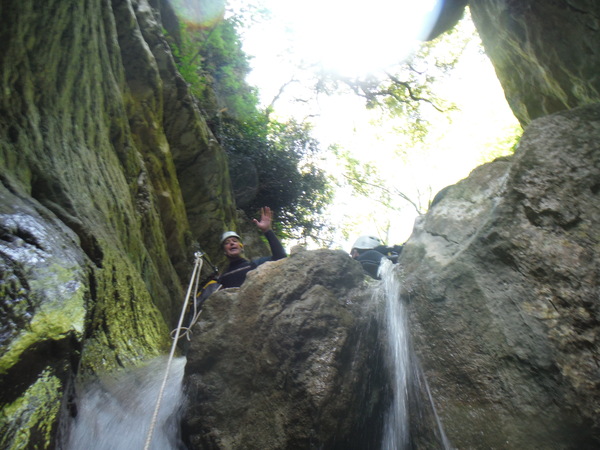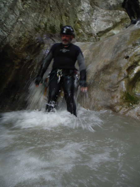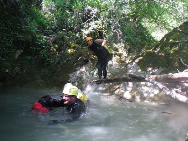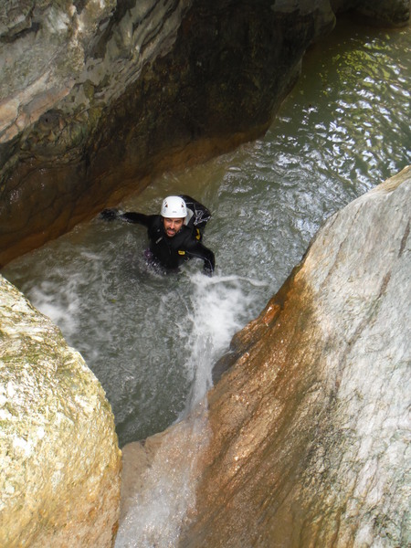 Alcuni tratti che percorriamo li ricordo ma sono dei flash, non riesco proprio a collegarli in sequenza con i vaghi ricordi che ho del resto della forra. Dopo un cammino quasi interminabile ma anche divertente arriviamo finalmente al primo saltino. Sulla sinistra si potrebbe fare un toboga ripido con un salto di circa 3 metri che finisce in una bella pozza. Poco piu’ avanti sulla parete c’e’ l’armo. La’ il salto e’ poca cosa, mentre gli altri indossano l’attrezzatura mi calo giu’ scivolando sulla schiena e vado a visionare la pozza d’acqua. E’ bella profonda e sgombra. Urlo agli altri che se vogliono possono fare il toboga. Mentre iniziano a saltare provo ad arrampicarmi per tornare su e fare il toboga anche io ma la roccia e’ liscia e scivolosa, a meta’ strada mi devo arrendere e mi tuffo da la’. Tento ancora la risalita da altri punti ma il risultato e’ sempre lo stesso quindi desisto. Chiedo a Roberto di lanciarmi lo zaino e procedo oltre. Da quel punto la forra si inforra un po’ di piu’ e diventa un pochino piu’ acquatica e divertente. Seguono un paio di salti un po’ piu’ impegnativi nei quali seguo con attenzione Max e Roberto che armano per la progressione secondo i moderni dettami della tecnica. Mi sembrano tutti accorgimenti ragionevoli, hanno il pregio di essere abbastanza semplici da porre in atto e di aumentare la sicurezza nella normale progressione. Dopo il primo salto “serio” ho ancora caldo e me ne rimango in acqua a fare le foto ai miei compari discendenti.