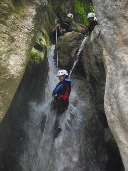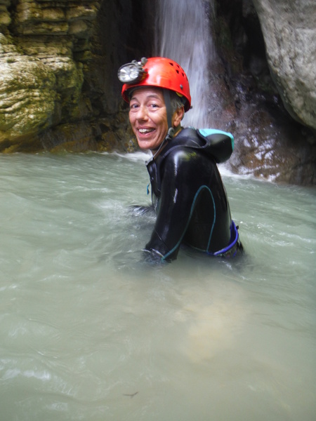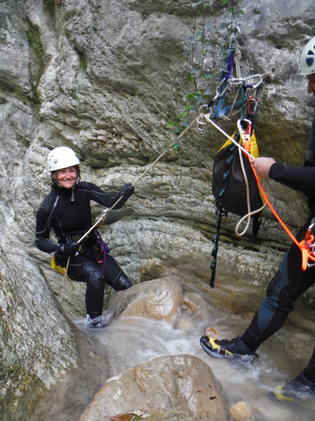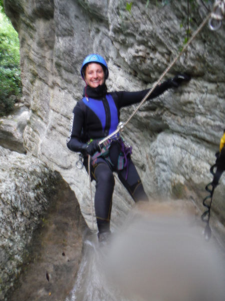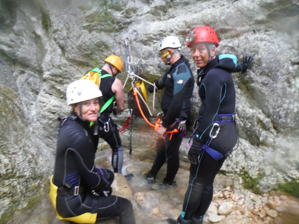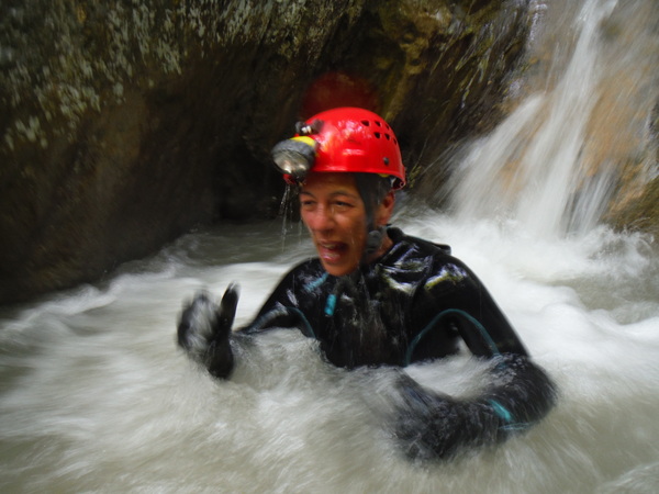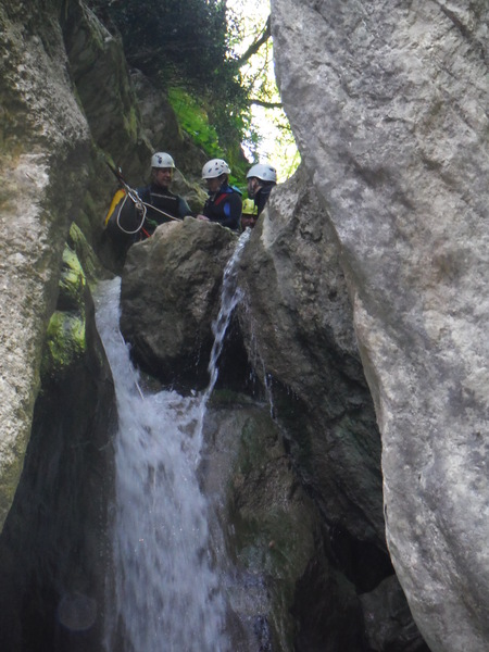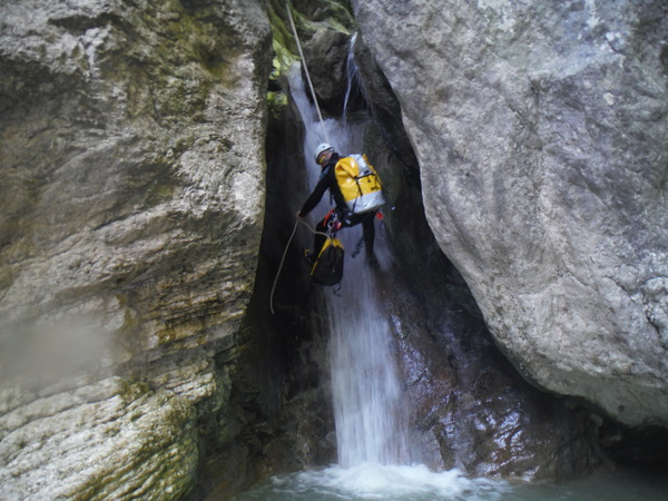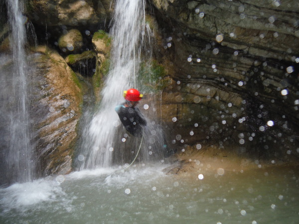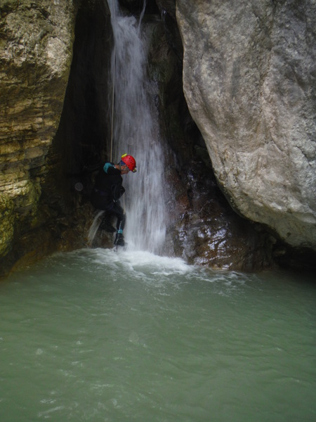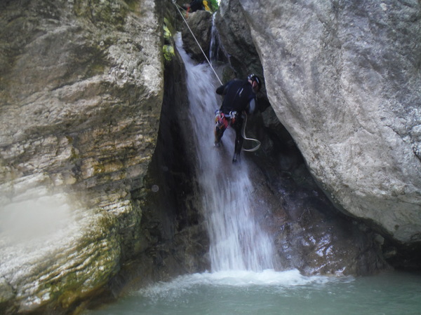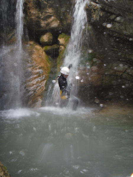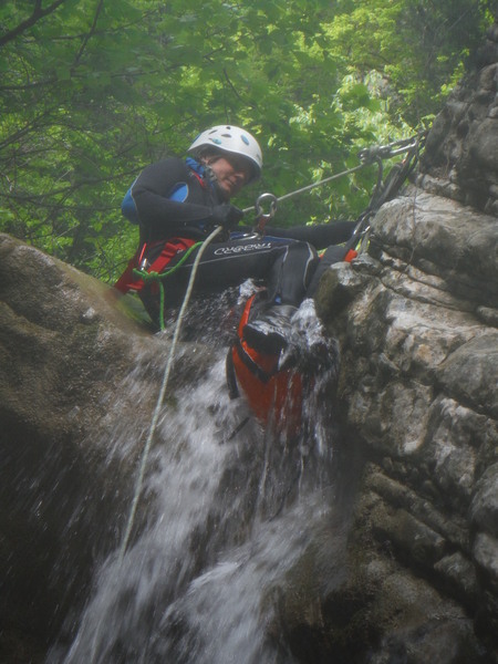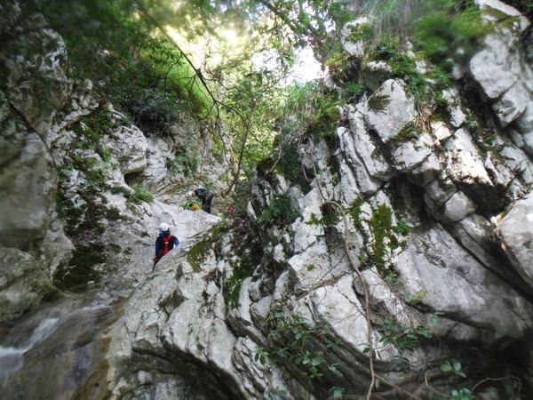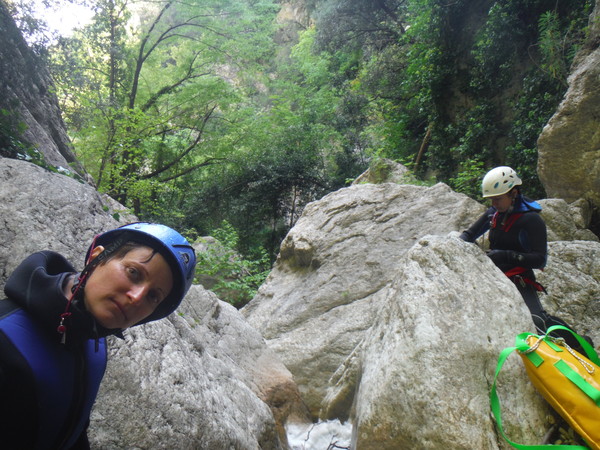 Forse esagero un po’ con lo stare in ammollo, inizio a sentire freddo e quando riparto, come temevo, arrivano anche dei fastidiosi crampi alle gambe da eccessiva sudorazione. Anche se oramai in ritardo, corro ai ripari iniziando a bere un integratore di sali che avevo portato proprio in previsione di questo. Non faccio le foto a tutti perche’ Roberto vuole andare avanti al salto successivo per sveltire la progressione. Io ho la seconda corda nello zaino e quindi lo seguo. Lascio a Veruska e Luisa la mia fida fotocamera cosi’ che possano fare le mie veci nel documentare la discesa.