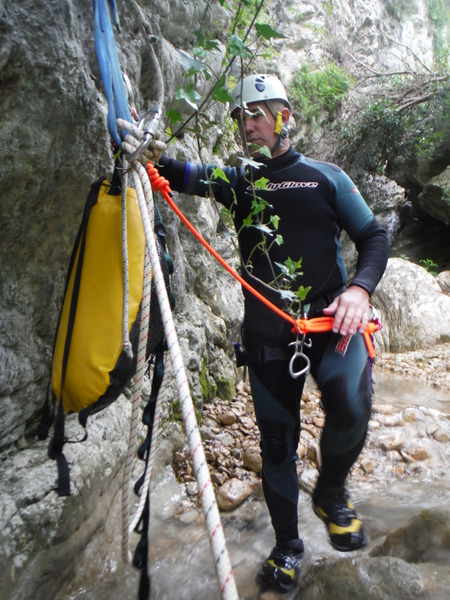 Quando ci fermiamo per il salto successivo mi fermo a guardare l’operato di Roberto ed inizio a sentire proprio freddo. Ho assolutamente bisogno di mangiare qualcosa. Sgranocchio un croccantino al sesamo mentre gli altri arrivano alla spicciolata ed affrontano la discesa con l’assistenza di Max che si e’ avvicendato con Roberto, sceso per regolare la lunghezza della corda. Condisco il tutto con la bevanda “salina” e gia’ inizio a sentirmi meglio. Siamo rimasti Max ed io. Mi mostra il metodo per fare il nodo di contrasto per scendere su corda singola anche da ultimo e poi scendiamo a raggiungere il resto del gruppo.