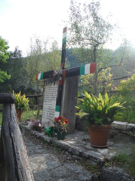 Vado. Peccato che il salto successivo…non ci sia. Abbiamo terminato la forra, dobbiamo solo cercare l’uscita. Arriviamo a degli sbarramenti artificiali in sequenza. Sono forse le “briglie” di cui parlava Max? Non ricordando con precisione le indicazioni per uscire decidiamo di guardarci in giro mentre aspettiamo che arrivi Max. Troviamo un sentiero che sale a destra del corso d’acqua. Roberto lo percorre per qualche metro per vedere se c’e’ qualcosa di buono, magari un vista delle macchine. La sua ricerca deve risultare vana perche’ torna indietro in pochi minuti. Ritorniamo sui nostri passi fino al greto del torrente, poi andiamo incontro ai nostri amici che oramai sono nei pressi. Quando siamo di nuovo tutti assieme chiediamo lumi a Max. Ci conferma che gli sbarramenti sono un primo indice della vicinanza dell’uscita e che ora dobbiamo cercare in alto i fili dell’alta tensione. Proseguiamo sul greto del torrente un po’ con il naso all’aria un po’ cercando un passaggio tra gli alberi caduti ed i rovi sempre piu’ fitti. Ecco finalmente i fili dell’alta tensione. Cerchiamo un sentiero sulla sinistra per uscire dalla forra. Siamo a meta’ di una curva a sinistra appena accennata quando qualcuno individua un passaggio letteralmente scavato in un grosso cespuglio. Anche se a me sembra l’opera di qualche mucca e’ comunque la migliore approssimazione di sentiero che c’e’ nei dintorni. Dopo il cespuglione c’e’ un “coso” rettangolare cintato da una grata metallica. E’ un buon segno. Il sentiero sembra migliorare anche se non sempre e’ evidentissimo. Continuiamo a salire procedendo in diagonale fino a svalicare. Arriviamo in una radura con alcuni pioppi sparsi. Ci sparpagliamo cercando il monumento agli elicotteristi che ci indichera’ l’inizio della strada per le macchine. Alla fine e’ Roberto a trovarlo e ci chiama a raccolta.