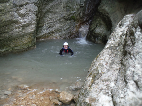 Poco piu’ avanti c’e’ un piccolo salto, i resti di un altro sbarramento artificiale. Si deve entrare in acqua. Magari e’ aggirabile ma ci siamo sorbiti tutta questa strada con la muta, ora e’ proprio il caso di sfruttarla. Mentre mi infilo il sottomuta e tiro su la salopette, Max e Roberto mi precedono. Il passaggio e’ semplice e si entra in acqua fino al collo. Mi fermo ad un metro dal saltino per fare qualche foto poi mi tuffo pure io. Che deliziosa frescura. Da questo punto in poi inizia una lunga camminata lungo il corso d’acqua. Ogni tanto incontriamo delle simpatiche pozze dove rinfrescarci con un tuffo ma nessuna calata.