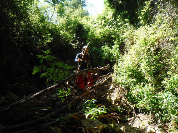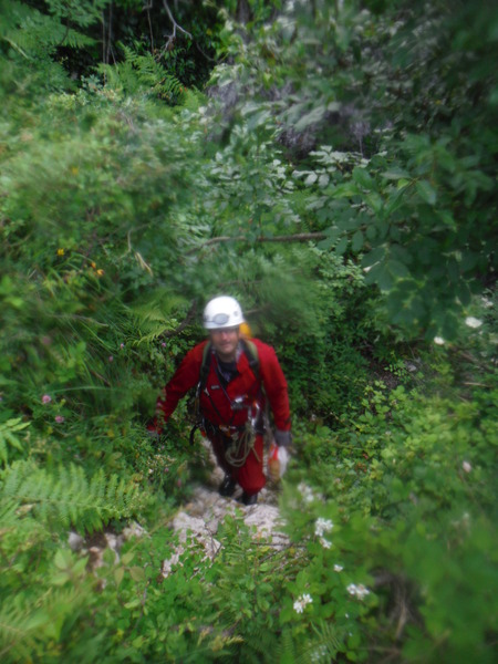 L’erta finale con gli zaini ben colmi di corde bagnate, ma anche di birre fresche e patatine!