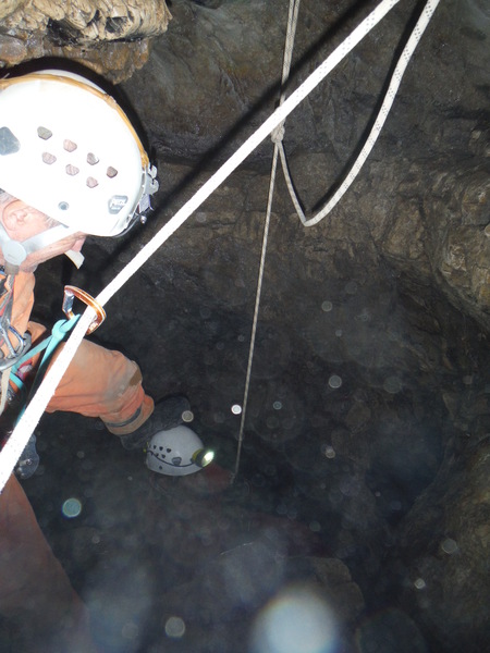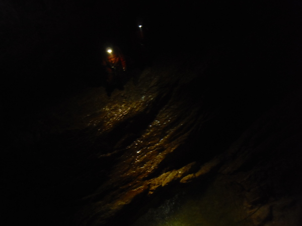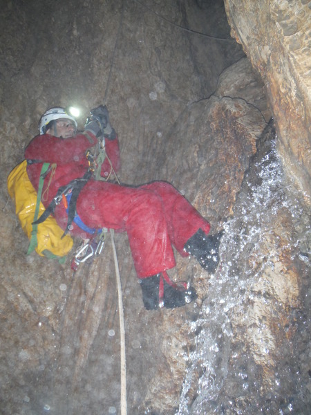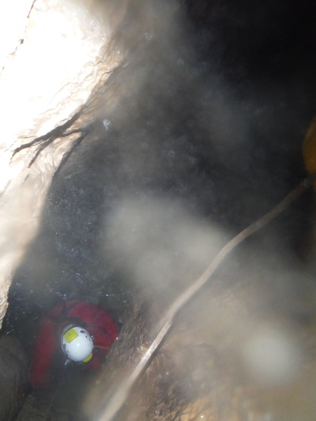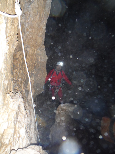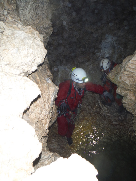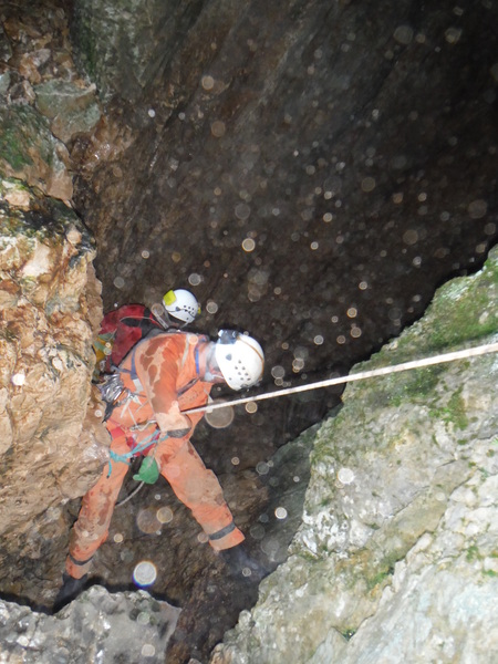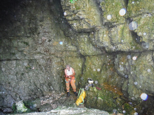 Le foto del nostro arrivo sopra al pozzo successivo, dove ci fermiamo per mancanza di corde, sono una vera fetenzia quindi le ho cestinate senza rimorsi. La prima foto che ho scattato che fosse minimamente degna di questo nome e’ questa, in cima al 23. E’ la bella vasca scavata nella roccia viva che accumula l’acqua che si riversa poi nel pozzo stesso.