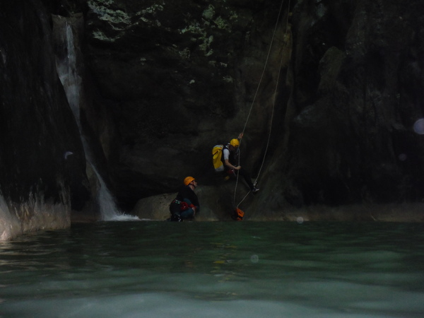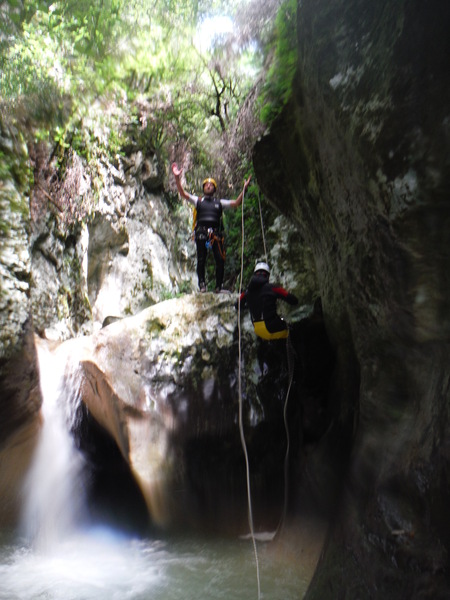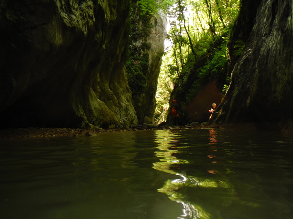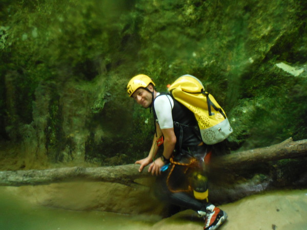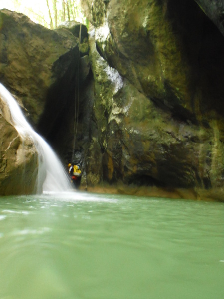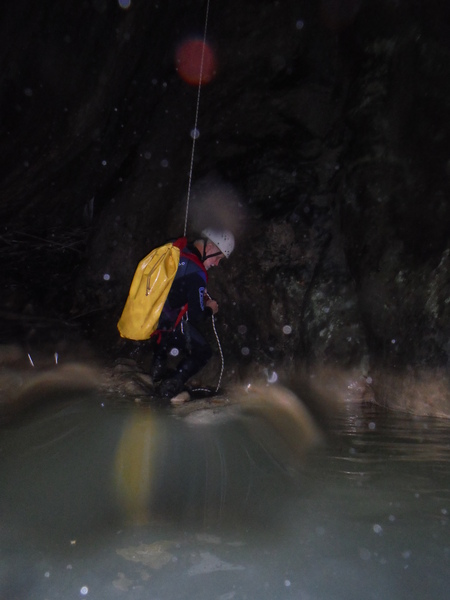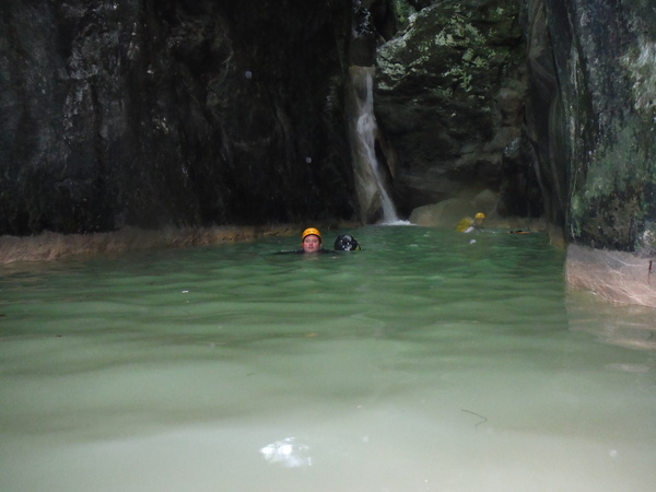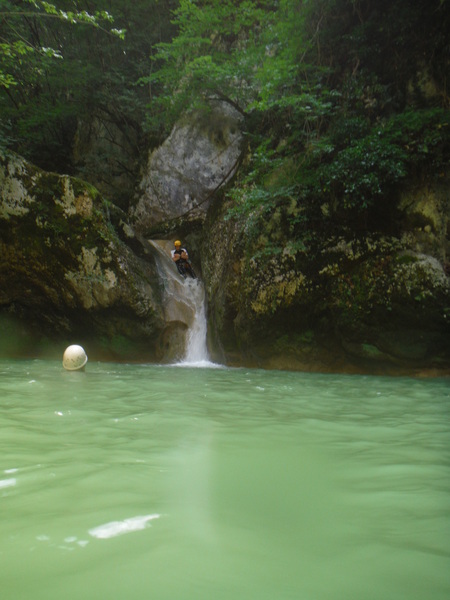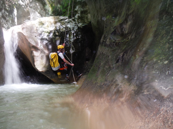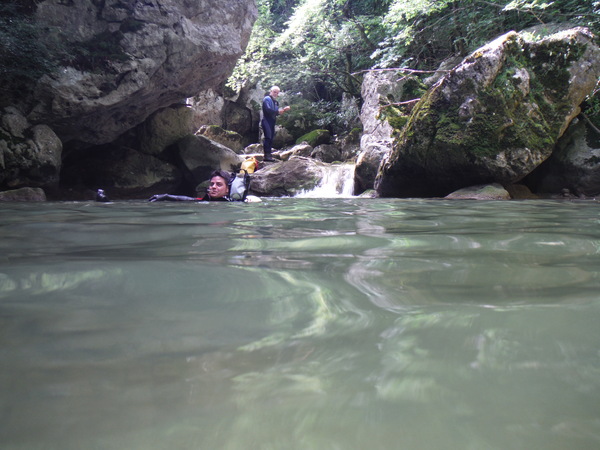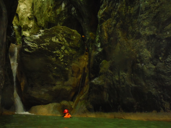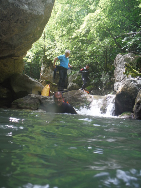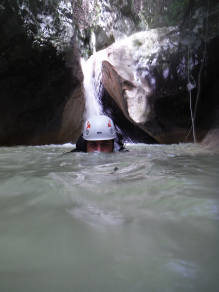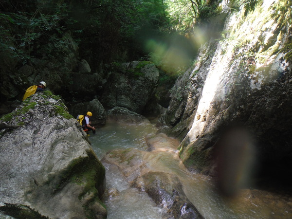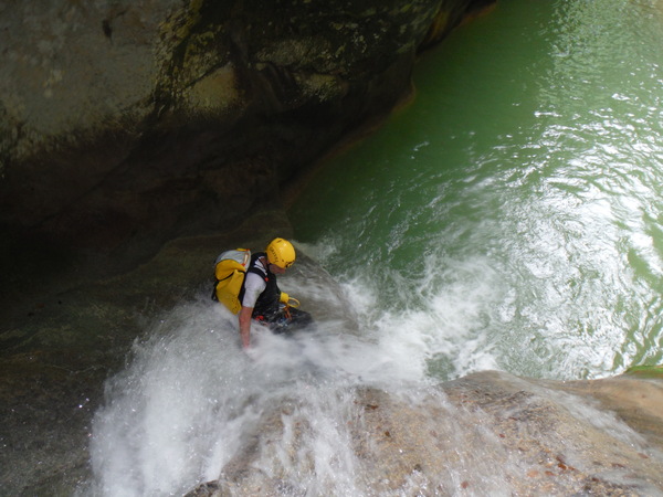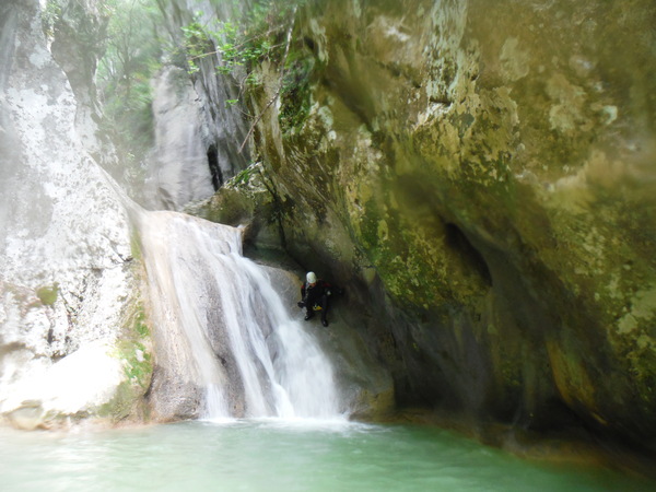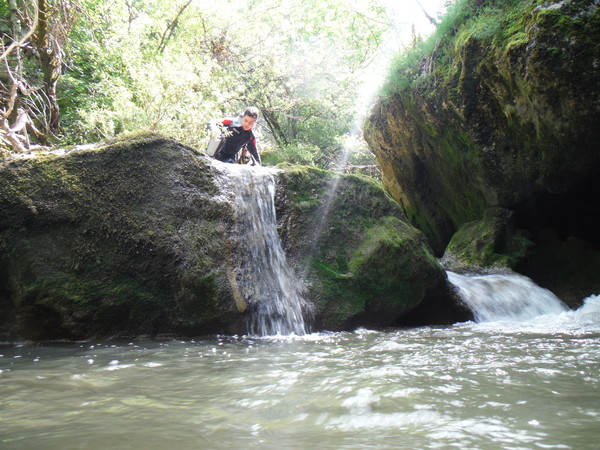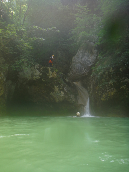 Saltino con discesa alternativa dalla cascatella. Questo, ci avverte Claudio, quando c’e’ piu’ acqua e’ uno dei salti piu’ insidiosi. L’acqua che scende dalla cascatella forma una corrente “controcorrente” che puo’ portare dentro al “nero” che si vede a destra della cascatella. Se si rimane intrappolati la sotto puo’ diventare complicato uscire per raccontarla. Ma per stavolta tutto bene, ecco Massimo che si prepara a saltare