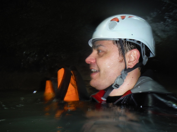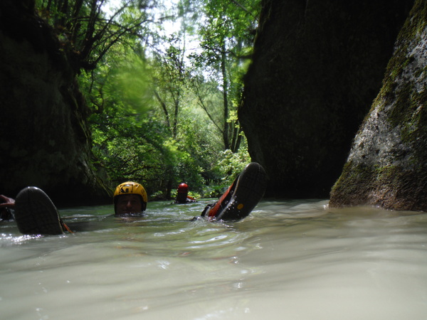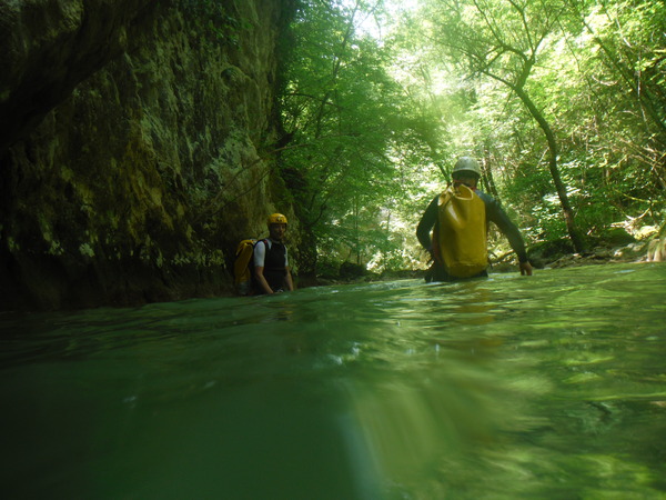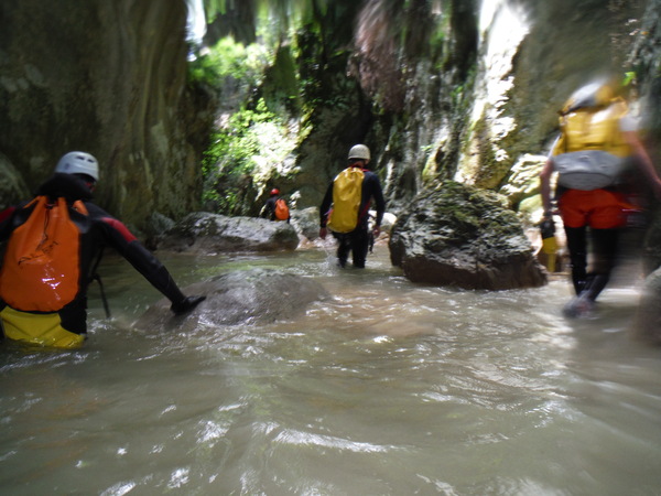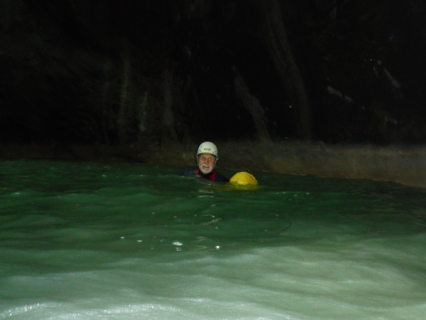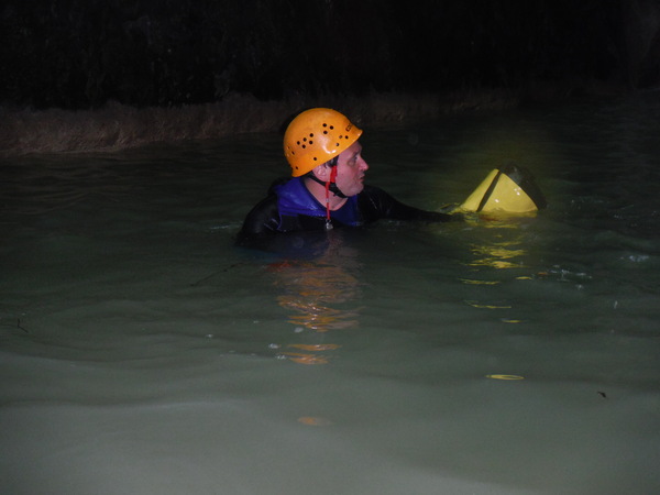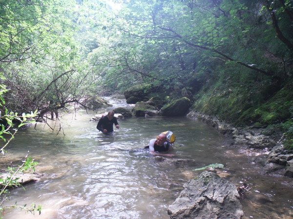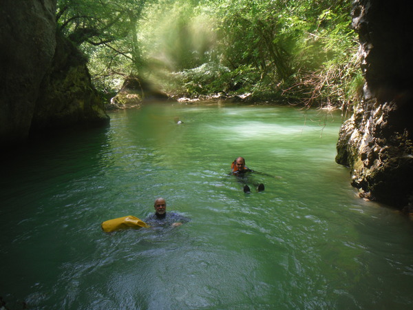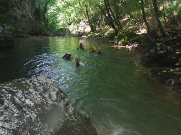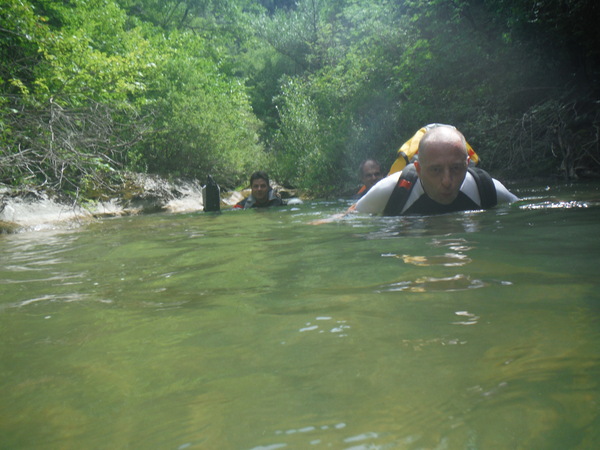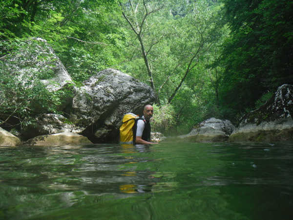 Ci sistemiamo alla meno peggio per una prosecuzione anfibia e proseguiamo sguazzando allegramente in acqua con molto sollievo per la frescura liquida.