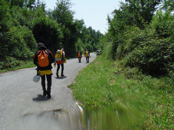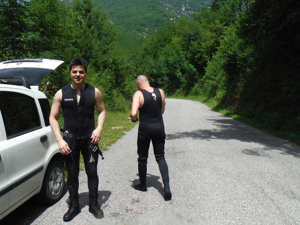 Camminare nel caldo asfissiante con la muta e vedere a pochi passi tante fresche acque e’ troppo per me. Inizio a borbottare a volume crescente che secondo me e’ meglio abbandonare il sentiero ed entrare in acqua. Ad un certo punto i miei amici, esasperati, cedono alle mie alle mie accorate preghiere.