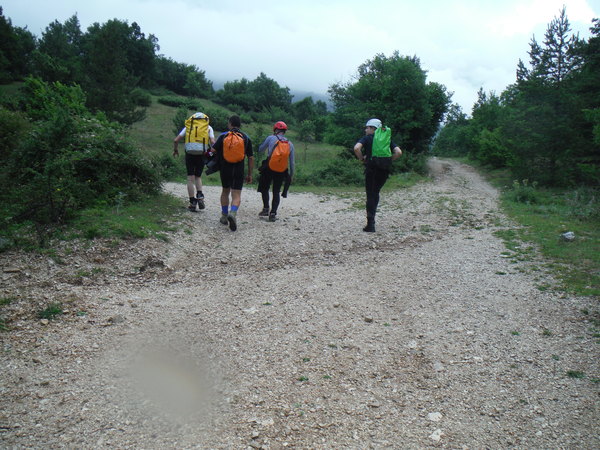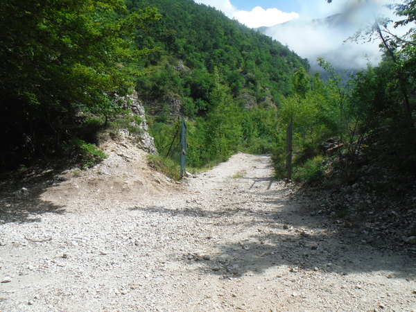Partenza della forra, a sinistra si prosegue per l’ostello, a destra si parcheggia e ci si prepara, la riga arancione sullo sfondo e’ il cancello.