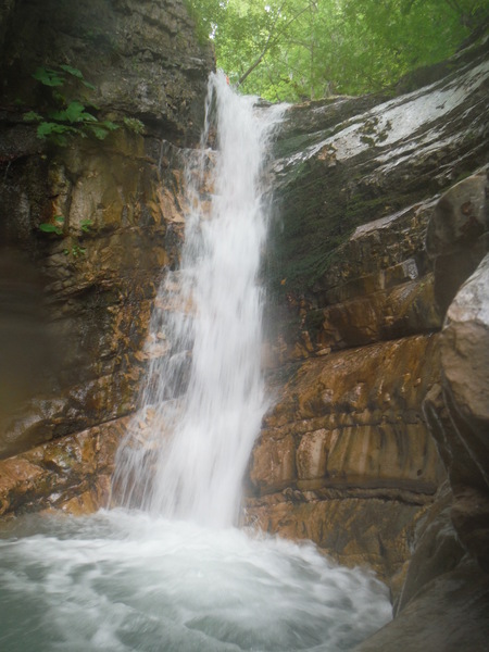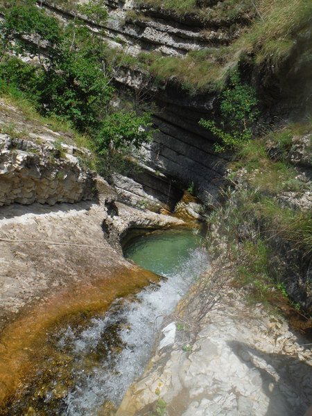 Qui si deve parcheggiare una macchina con i vestiti asciutti che saranno sicuramente molto comodi piu’ tardi. Una volta predisposto il tutto si abbandona la macchina con il cambio. Con le restanti (nel nostro caso una) si parte alla volta della partenza della nostra forra. Si ripercorre in senso inverso la stradina fino al curvone con spiazzo. Li si prende a sinistra. Si segue la via principale in direzione Calcara (si passa accanto allo stadio del ghiaccio). Al bivio per Calcara si prende a sinistra. Si incontra ancora un bivio e si prende a destra in direzione dell’Ostello della Gioventu’ Colorito (cosi’ si chiama). Al bivio successivo si prende a destra (a sinistra prosegue la strada per l’ostello) e dopo almeno 3 metri si parcheggia, la strada e’ chiusa da una robusta sbarra. Ci si prepara al meglio per una bella passeggiata e seguente bagno prolungato, si chiude la macchina e si parte. Si segue il comodo sentiero per circa 2,5 km. Dopo poco camminare si incontra ancora un bivio, si prosegue a sinistra. Il sentiero principale e’ evidente e deve essere seguito fino alla fine, quando si incontra ancora un cancello. Poco piu’ avanti sul sentiero si vede una costruzione in cemento. Si passa il cancello e subito a sinistra si prende un comodo sentierino in discesa. Pochi metri di fresche fratte e sei all’inizio della forra. Si presenta subito bene con una bellissima pozza ed una cascata altrettanto bella.