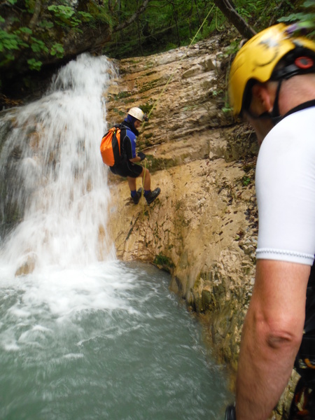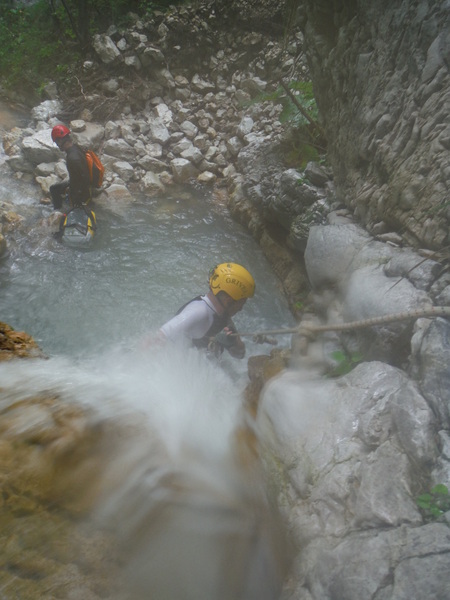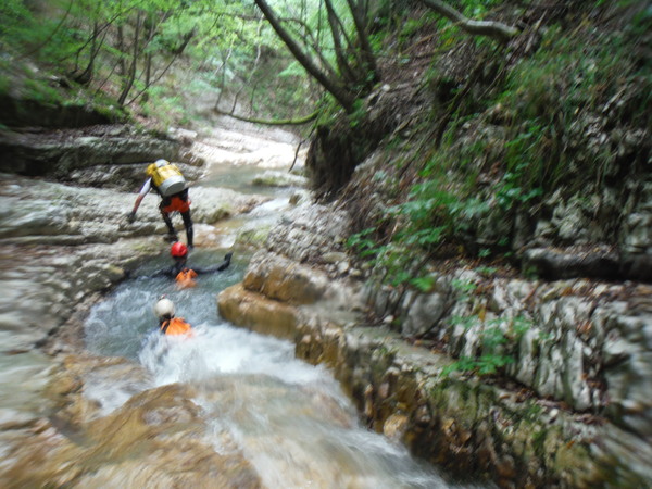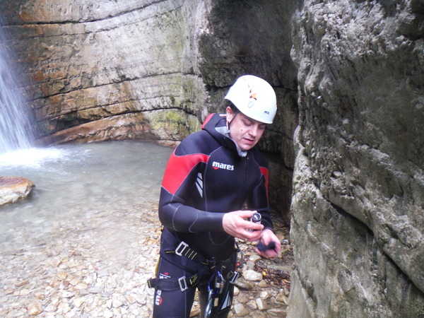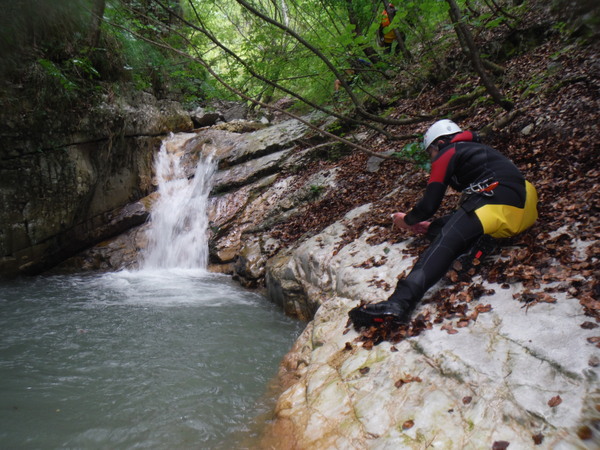 Bella! L’acqua e’ freddissima, sembra ghiaccio appena appena sciolto e’ di rigore la muta. Le pietre sono scivolosissime, nemmeno le scarpe super-tecnologiche e specializzate da forra di Claudio riescono a far presa in maniera decente.