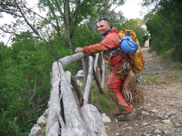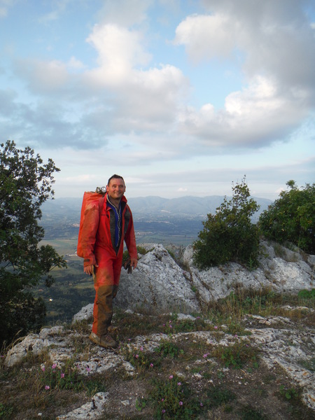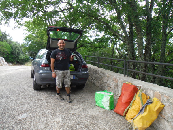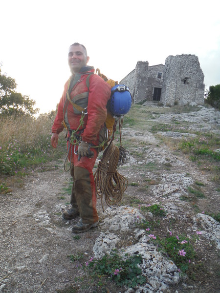 Abbiamo un bel mucchio di materiale, tutte le corde e gli attacchi per armare la grotta, il necessario per lavorare nel punto dove vorrei arrivare, tanta acqua, la pizza di Stefano. Partiamo carichi come muli ma decisi a passare una bella giornata in grotta.