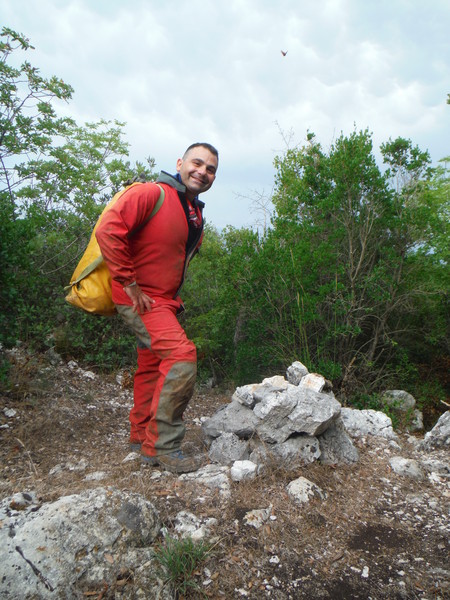 Oggi, con me a scattare le foto e Stefano come unico bersaglio, credo lo vedrete spesso. Infatti eccolo in posa vicino all’ometto che indica la deviazione per la grotta