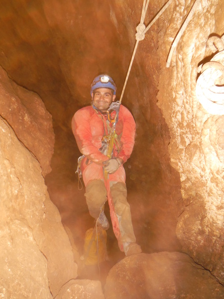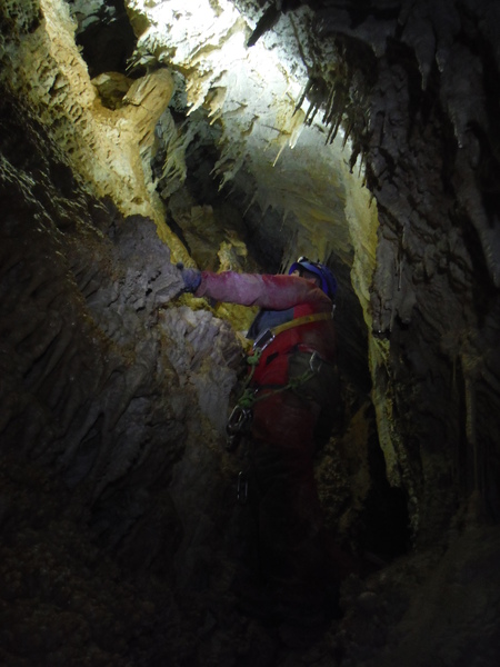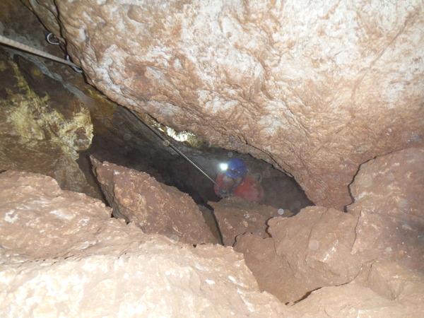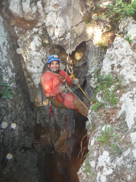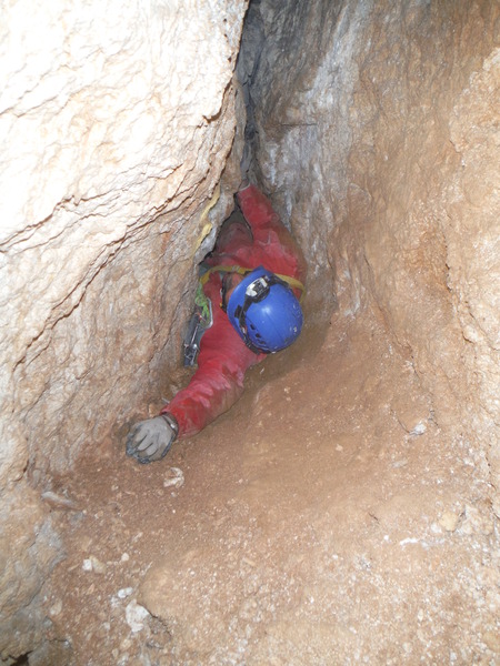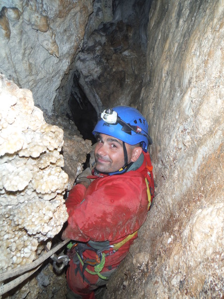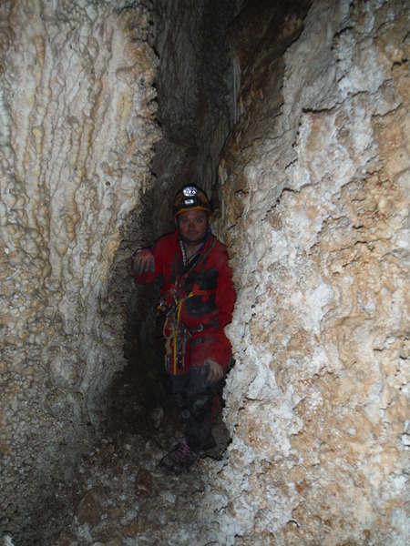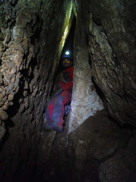 finiamo svelti di prepararci ed entriamo, oggi sara’ Stefano a divertirsi con l’armo, si carica come un mulo con le corde e gli attacchi e parte. Eccolo alle prese con la (finta) strettoia
