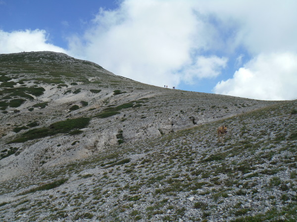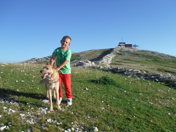 Anche grazie ai cani facciamo amicizia con Cristian, il nipote del proprietario dell’albergo. E’ un vivace e simpatico bimbo. Con l’approvazione del nonno lo invito a seguirmi per una passeggiata, voglio andare a rivedere l’ingresso della grotta degli Urli. Partiamo baldanzosi con la compagnia di Luna che ha capito l’antifona e tira al guinzaglio come una dannata mentre attraversiamo il piazzale. Appena arriviamo al prato la sciolgo e lei parte come un missile. Noi la seguiamo con piu’ calma. Arriviamo a scavallare la cresta che ricordavo, ma trovo una sorpresa, dall’ultima volta che sono stato qui e’ stata creata una nuova pista che passa sicuramente vicino alla grotta. Non mi ritrovo per nulla. Chiacchierando con Cristian scendiamo lungo la pista oltrepassando, ne sono sicuro, la zona dove si apre la grotta. Se ho capito bene la nuova pista si chiama “del Vermicano”, la seguo con gli occhi scendere fino agli alberi e poi fare un curvone a sinistra.
