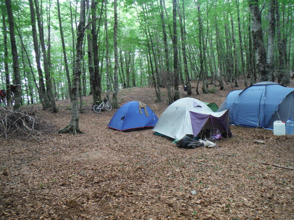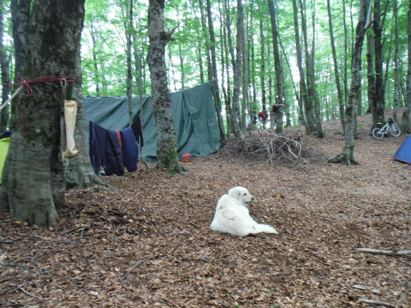 Dopo questo preludio che ha ben poco di speleologico, il giorno dopo facciamo una robusta colazione e poi abbandono Betti con tutta la “caneria” e parto alla ventura. Mi fermo quasi subito, incontro Anna, sono decenni che non la vedo, uno scambio di saluti e chiacchiere e’ d’obbligo. Mi dice che sta andando da Tarcisio, che ha la base poco distante dall’albergo. Mi aggrego con entusiasmo. Passiamo cosi’ almeno un paio d’ore con loro che raccontano le avventure, le scoperte e le prospettive future nella zona di campo catino. Ascolto con interesse recuperando, grazie ai loro ricordi, un gap di assenza di quasi almeno 3 lustri. Mi raccontano del Gemma Gresele, di Gnomo Gnomo e di altre scoperte ed esplorazioni fatte negli anni scorsi. Guardiamo la cartina mentre loro pianificano eventuali ricognizioni future. Tra una chiacchiera ed un ricordo arriviamo quasi alle 11. Oramai al campo dovrebbero essere tutti svegli ed attivi. Decidiamo quindi di raggiungerli. Saliamo fino all’osservatorio e quindi sulla strada sterrata. E’ un bel pezzo di strada. Per via incrociamo anche dei camion ed altri macchinari. Producono legna da ardere a tonnellate ed ora sono in piena attivita’. Poco piu’ avanti ecco finalmente il campo. Non c’e’ tantissima attivita’, in cambio ci sono numerosi cani.