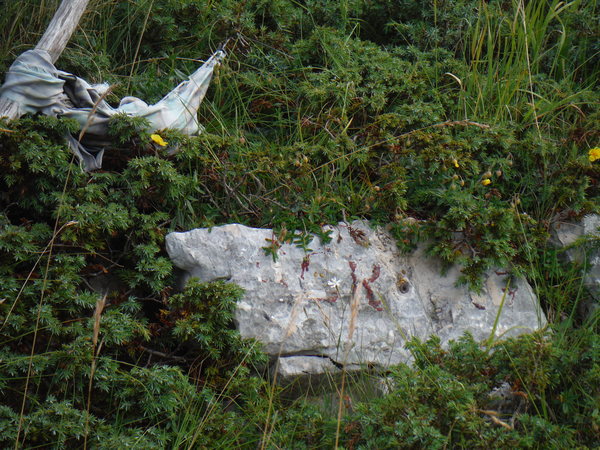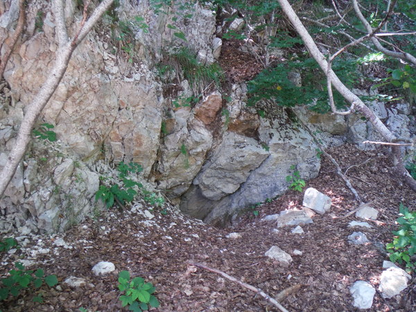 Inizio a scendere nella valletta per risalire sulla sponda opposta quando incontro il Pozzo dell’antipasto. Al momento non so cosa sia quel buco che pare andare parecchi metri, vedo pero’ uno spit vecchiotto che indica che e’ stato sceso. Scopriro’ di che si tratta chiedendo, tempo dopo, a Gianni che me ne racconta anche la storia. Nei primi anni ’80, credo, Marco e Gianni erano in ricognizione nei dintorni e trovarono 2 bei buchi che promettevano. Decisero di spartirseli da bravi fratelli, Gianni opto’ per quello che chiameranno il Pozzo dell’antipasto, Marco per gli Urli. Visto lo sviluppo degli Urli il povero Pozzo dell’antipasto e’ poi caduto nel dimenticatoio. Sembra non ci siano stati altri sviluppi da allora.