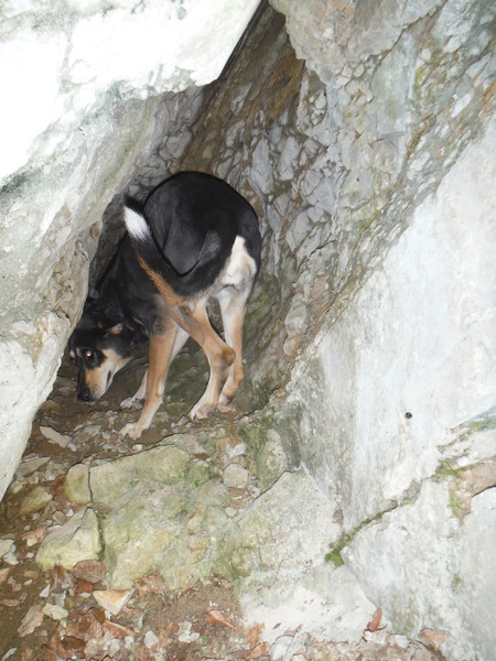 La cosa prende molto tempo perche’ la strettoia successiva e’ impegnativa e lo spazio dopo sembra essere esiguo. Esco di nuovo a prendere una boccata d’aria calda! Tarcisio intanto tiene a bada i cani che vorrebbero entrare in grotta.