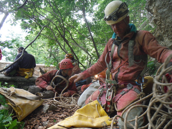Ora il campo e’ decisamente piu’ popolato. Scopriamo che la giornata sara’ dedicata agli “spelei” futuri. Molti di questi ragazzi inizieranno oggi con la loro esperienza speleologica. Anche in questo caso mi aggrego piu’ che volentieri e mi preparo velocemente.