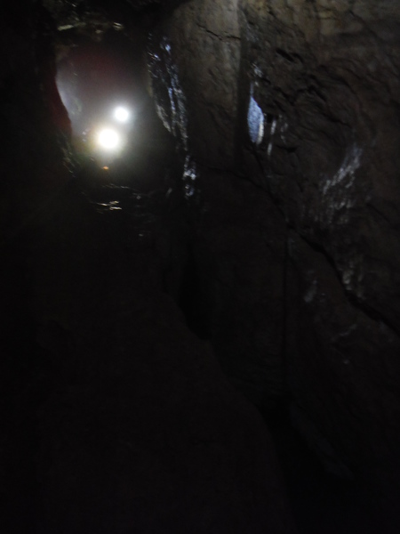 Tarcisio restera’ fuori a fare da “palo”, noi tutti entriamo con calma, perche’ subito dopo l’ingresso ed un saltino di un metro c’e’ un ambiente ma poi c’e’ subito un’altra strettoia, un laminatoio orizzontale con una simpatica curva a sinistra per uscirne.