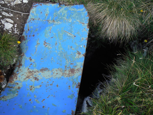 Come dicevo, risalgo sulla sponda opposta e finalmente ritrovo l’ingresso della grotta degli Urli. E’ parzialmente coperto da una lastra di metallo blu ma e’ indubbiamente lui!
